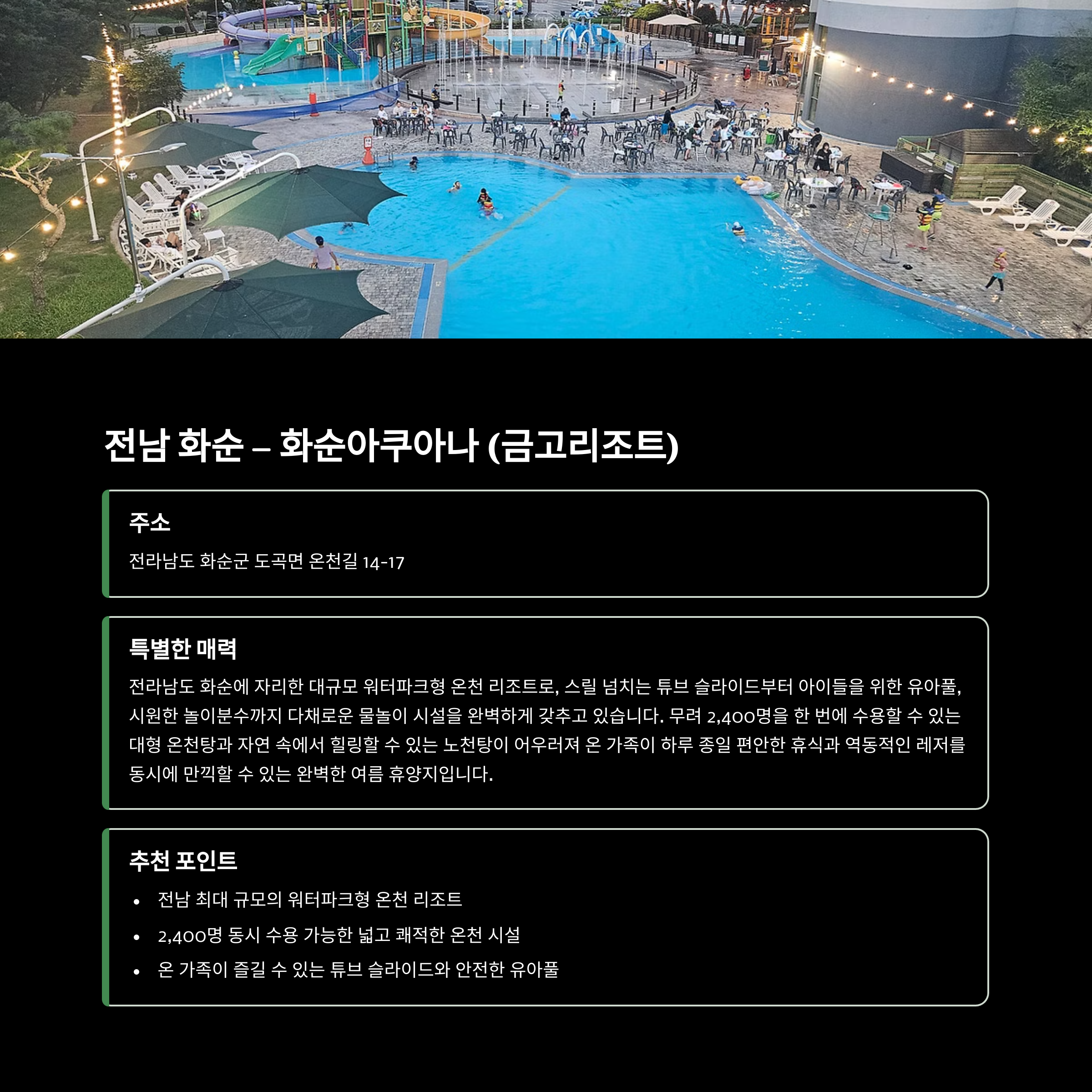 | 전남 | 화순 아쿠아나 | 화순군 온천길 14-17 | 대형 규모+유아존 포함 |