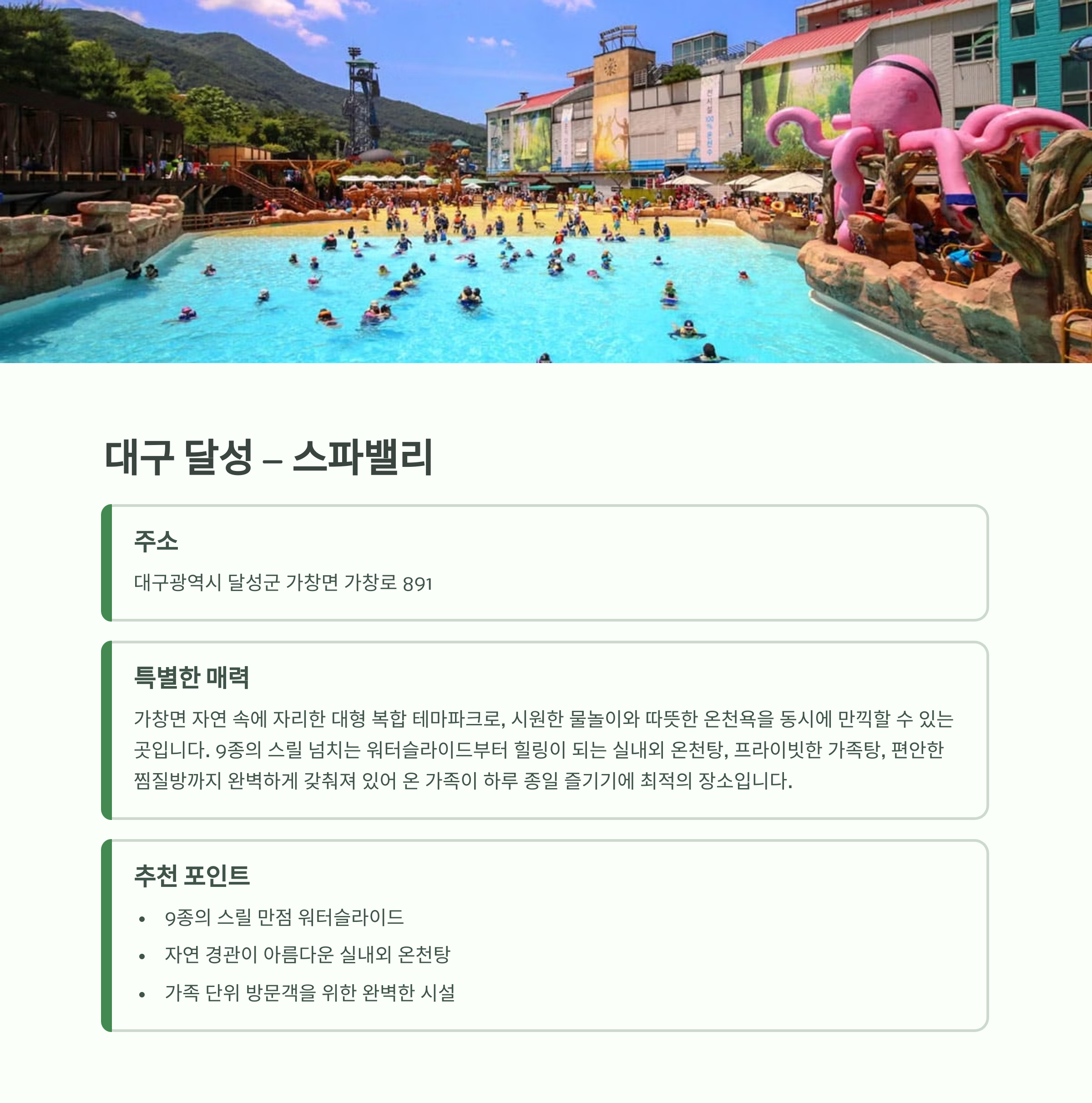 | 대구 | 스파밸리 | 달성군 가창로 891 | 슬라이드+노천탕 |