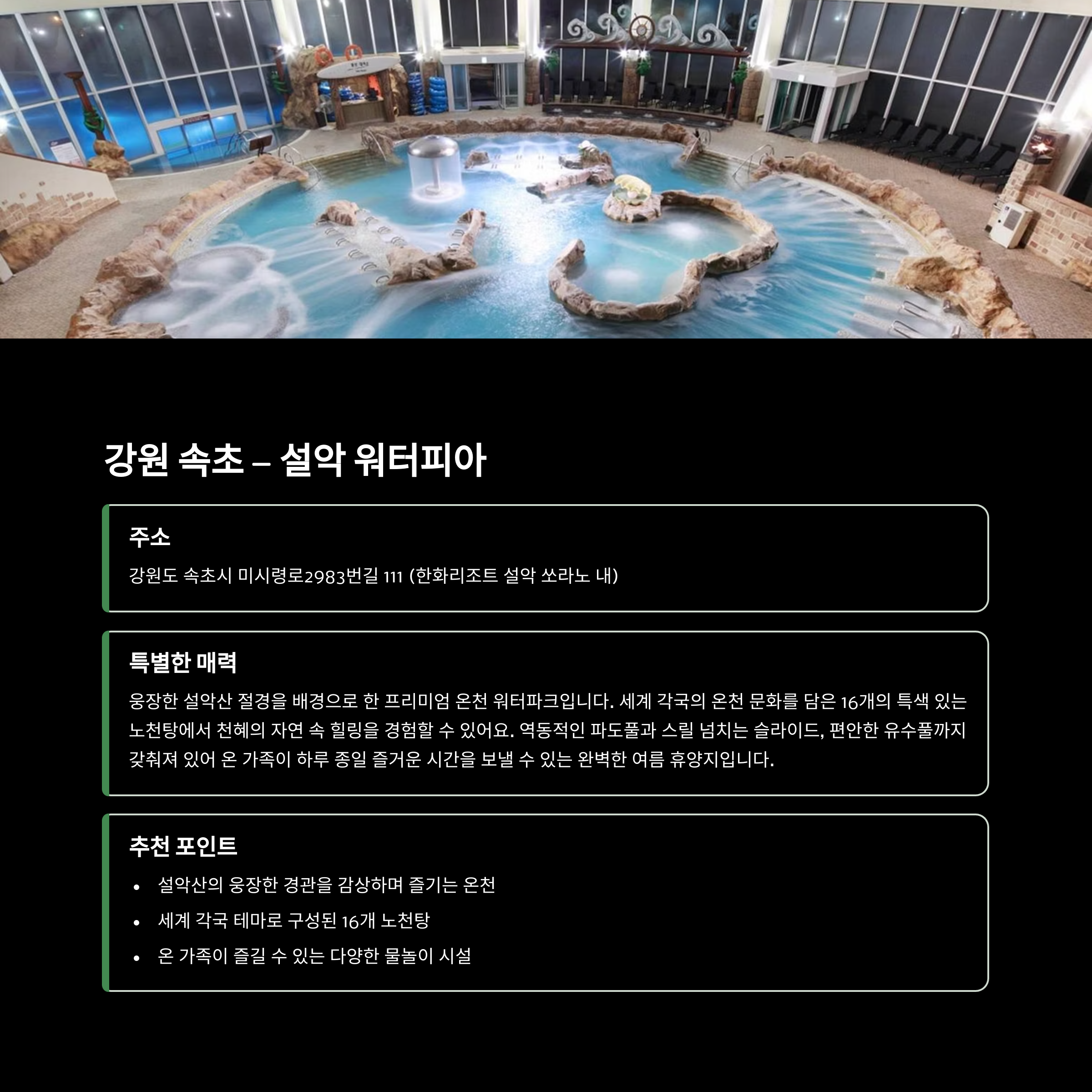 | 강원 | 설악 워터피아 | 속초시 미시령로2983번길 111 | 설악산뷰+16개 노천탕 |