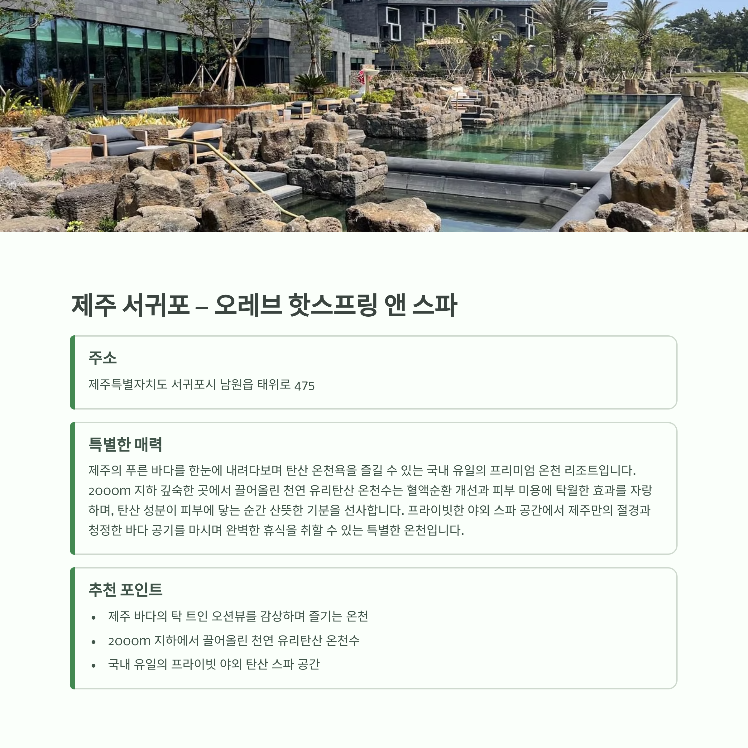 | 제주 | 오레브 핫스프링 앤 스파 | 서귀포시 태위로 475 | 탄산 온천+야외 프라이빗 스파 |