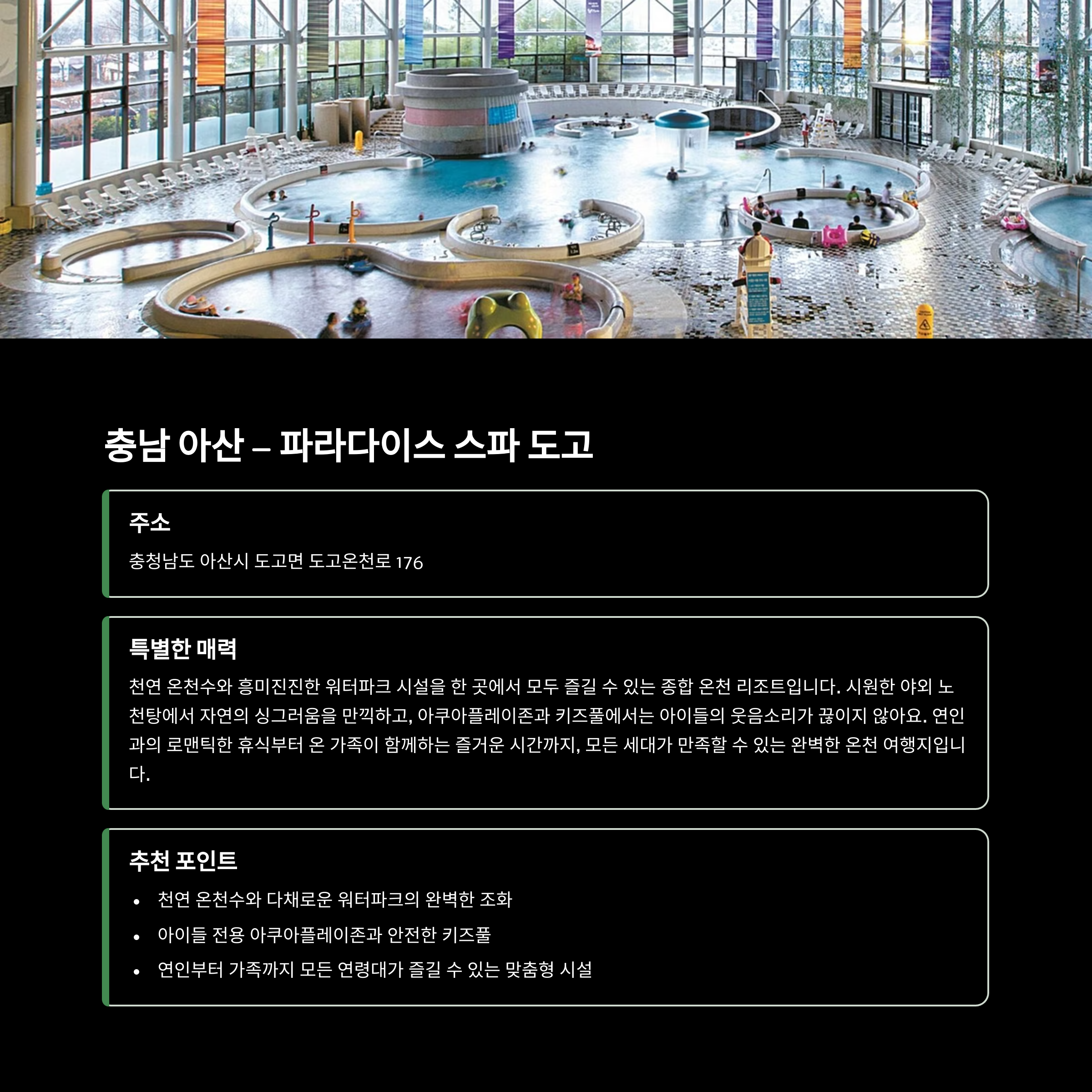 충남 | 스플라스 리솜 | 예산군 온천단지3로 45 | 실리카 온천+대형 시설 |