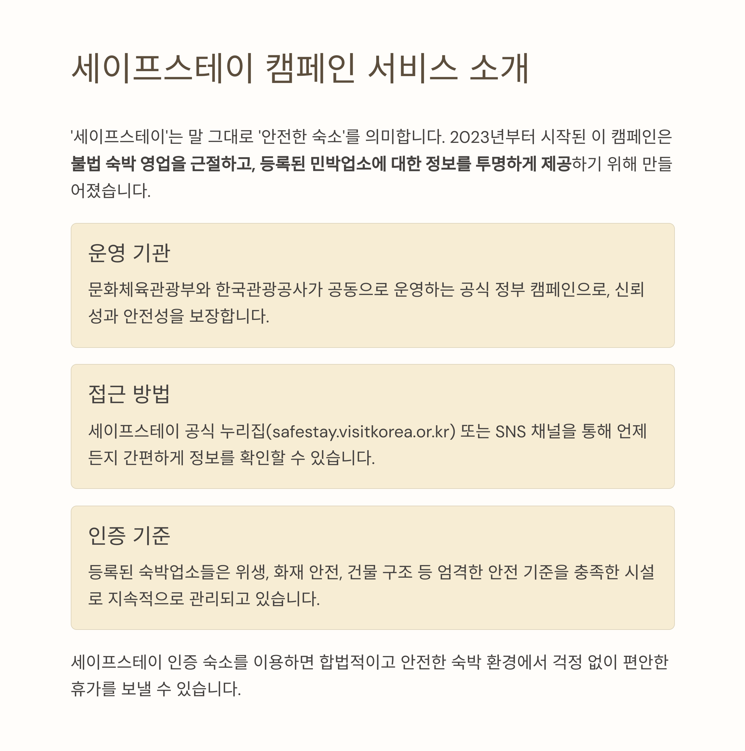문화체육관광부와 한국관광공사가 함께 운영하며, 세이프스테이 공식 누리집(safestay.visitkorea.or.kr) 또는 SNS 채널을 통해 정보를 제공하고 있어요.