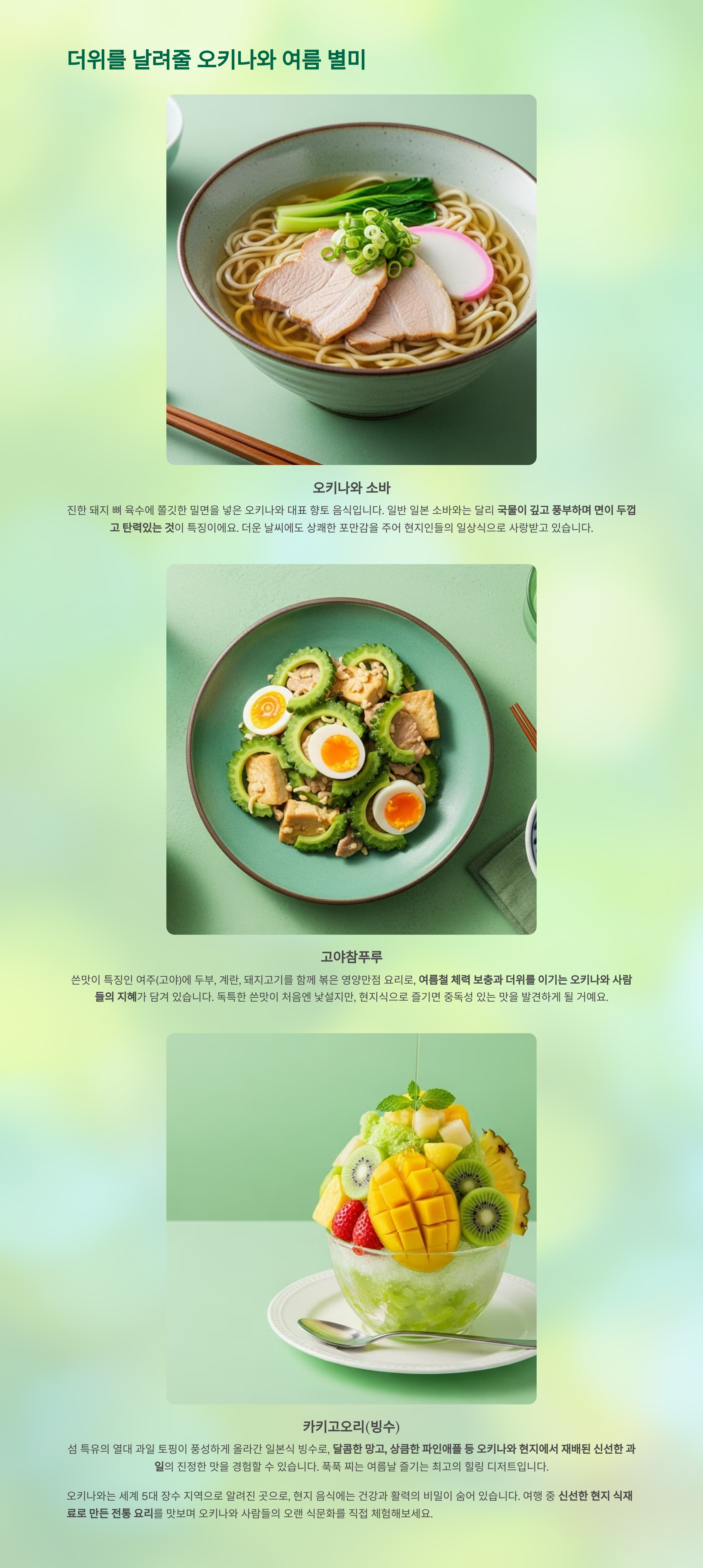여름 오키나와 여행이라면 지역 식재료를 활용한 음식도 꼭 맛보세요.