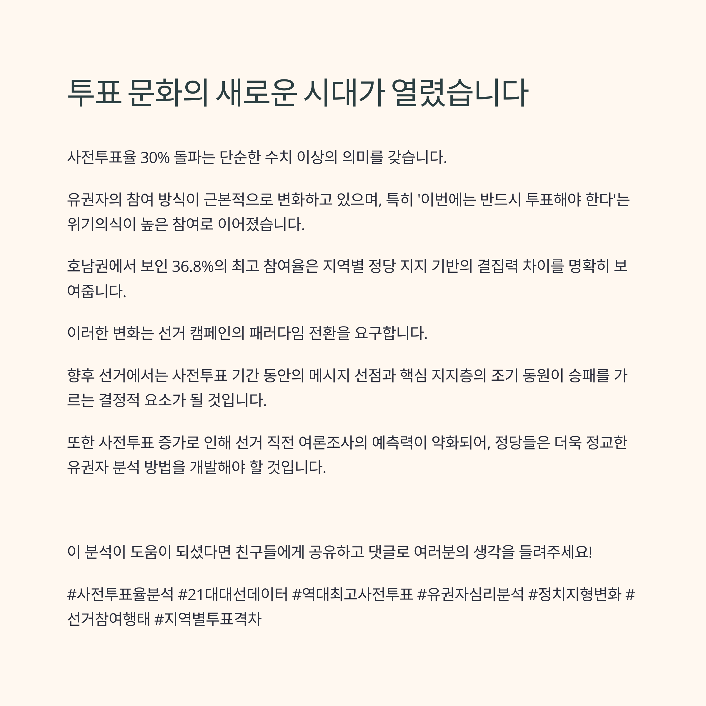 - 영남권: 고령 유권자 중심의 강한 사전 참여율