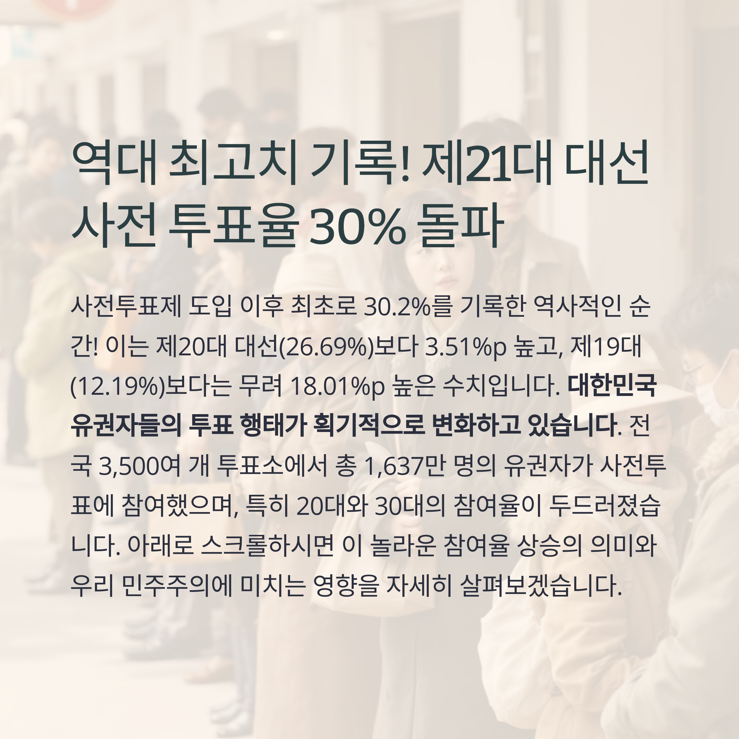 2025년 제21대 대통령 선거에서 사전 투표율이 30%를 넘으며 역대 최고치를 기록했어요.