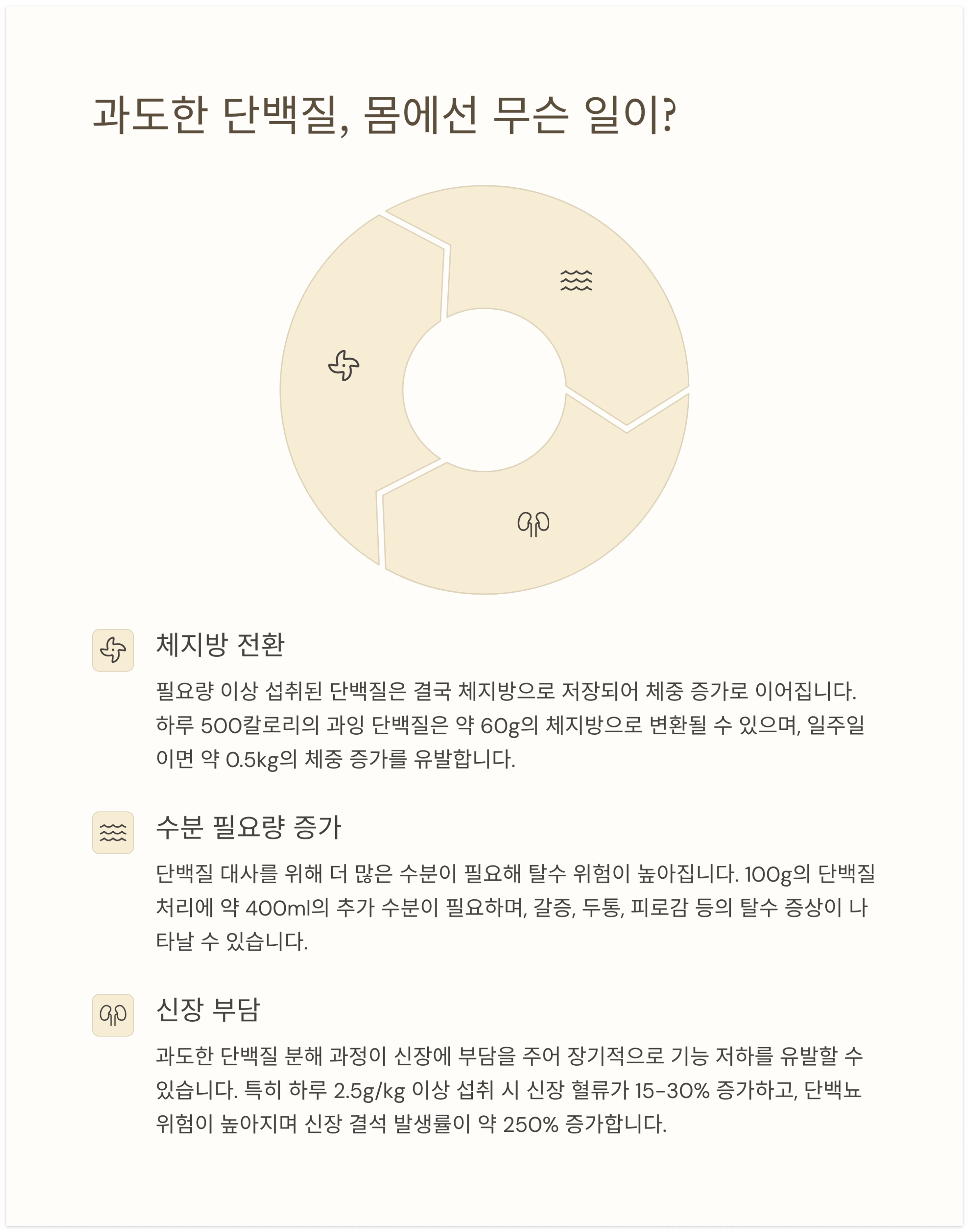 문제 발생 원인 | 과도한 단백질은 잉여 열량으로 저장되며, 탄수화물 부족 시 신체 대사 리듬이 무너질 수 있음 |