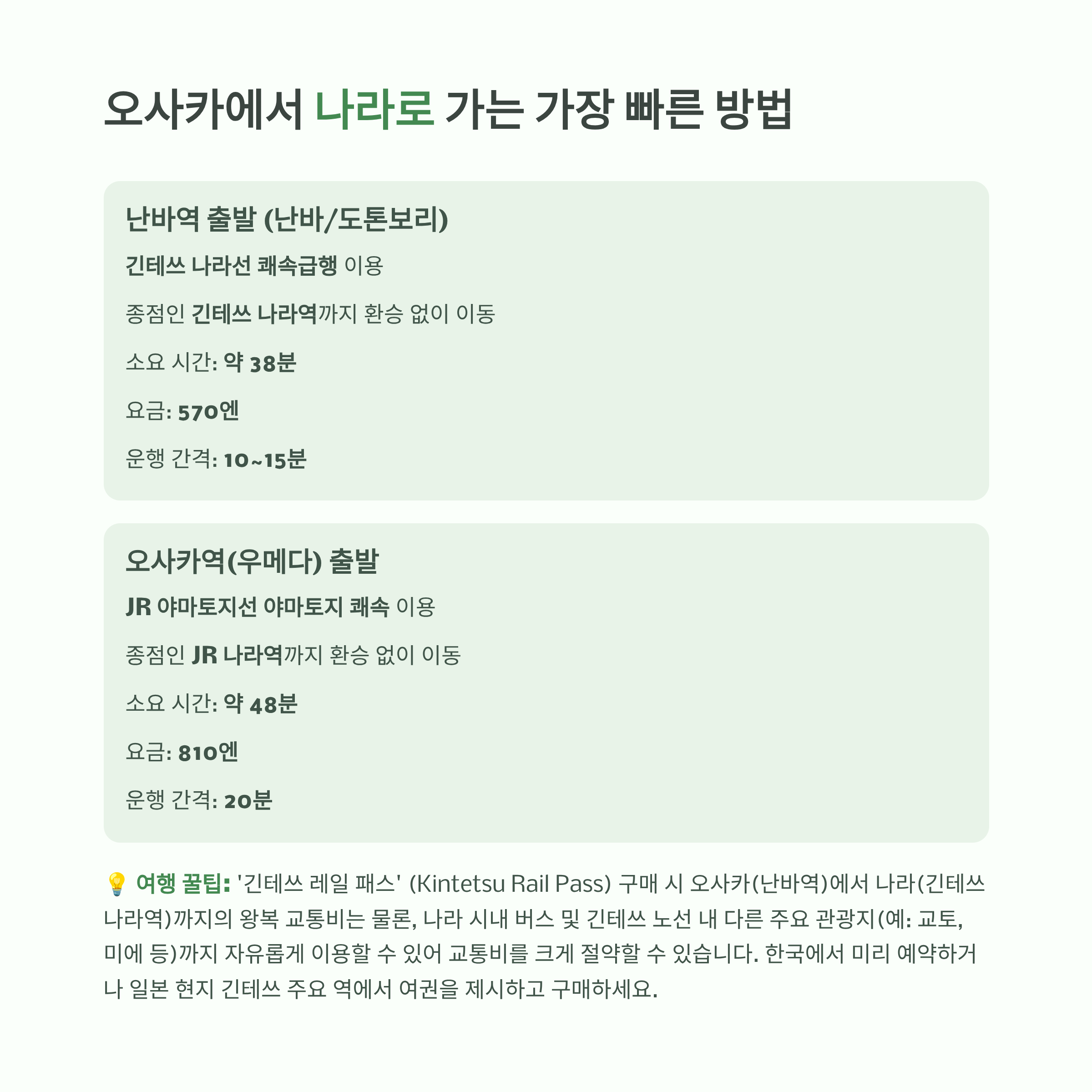 오사카에서 나라로 갈 때는 주로 기차를 이용해요. 출발지에 따라 노선이 달라지니, 본인의 여행 동선에 맞는 방법을 선택하는 것이 중요해요.