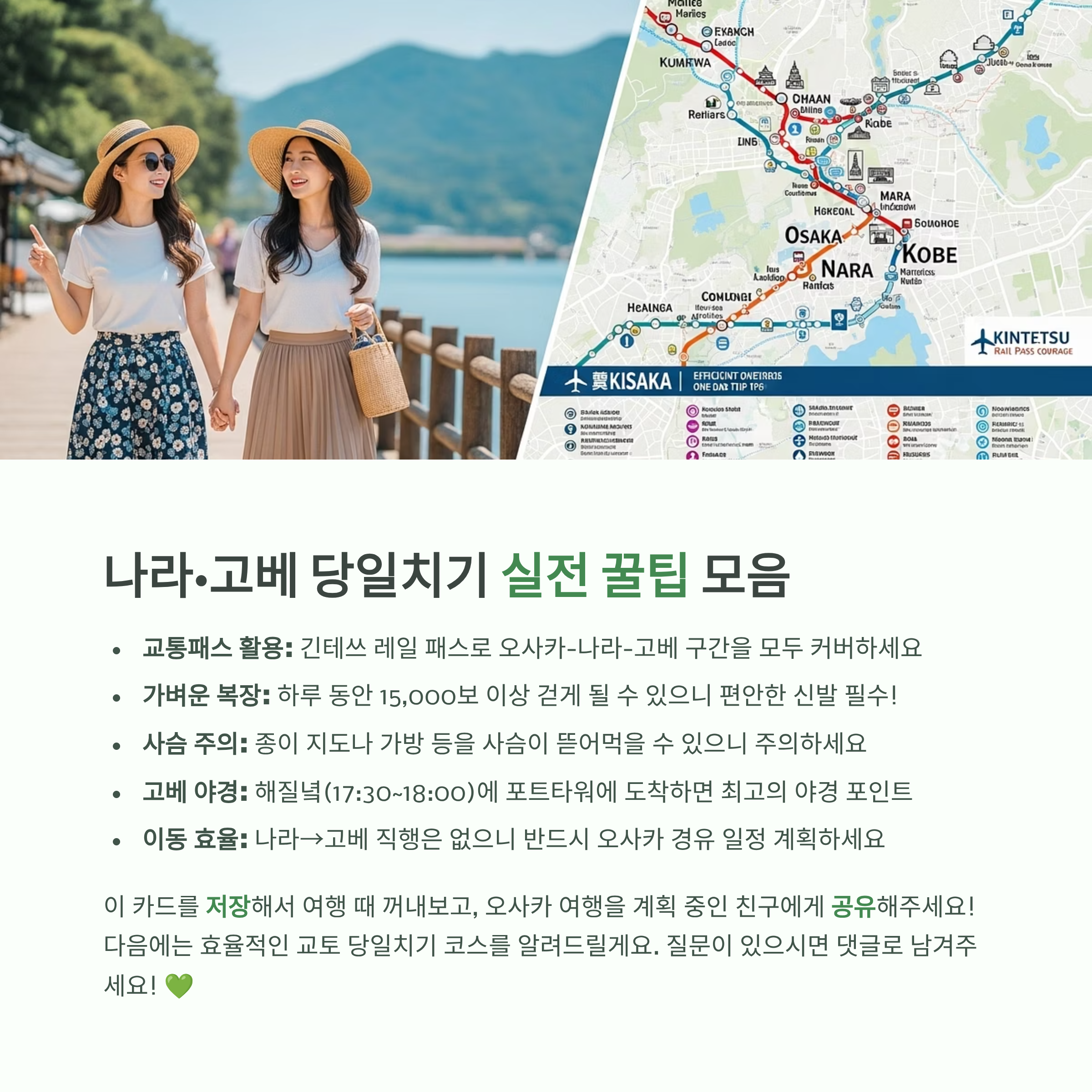 나라의 고즈넉한 정취와 고베의 낭만적인 야경을 하루에 모두 경험하는 알짜 코스예요. 대략적인 시간은 교통 상황에 따라 달라질 수 있어요.