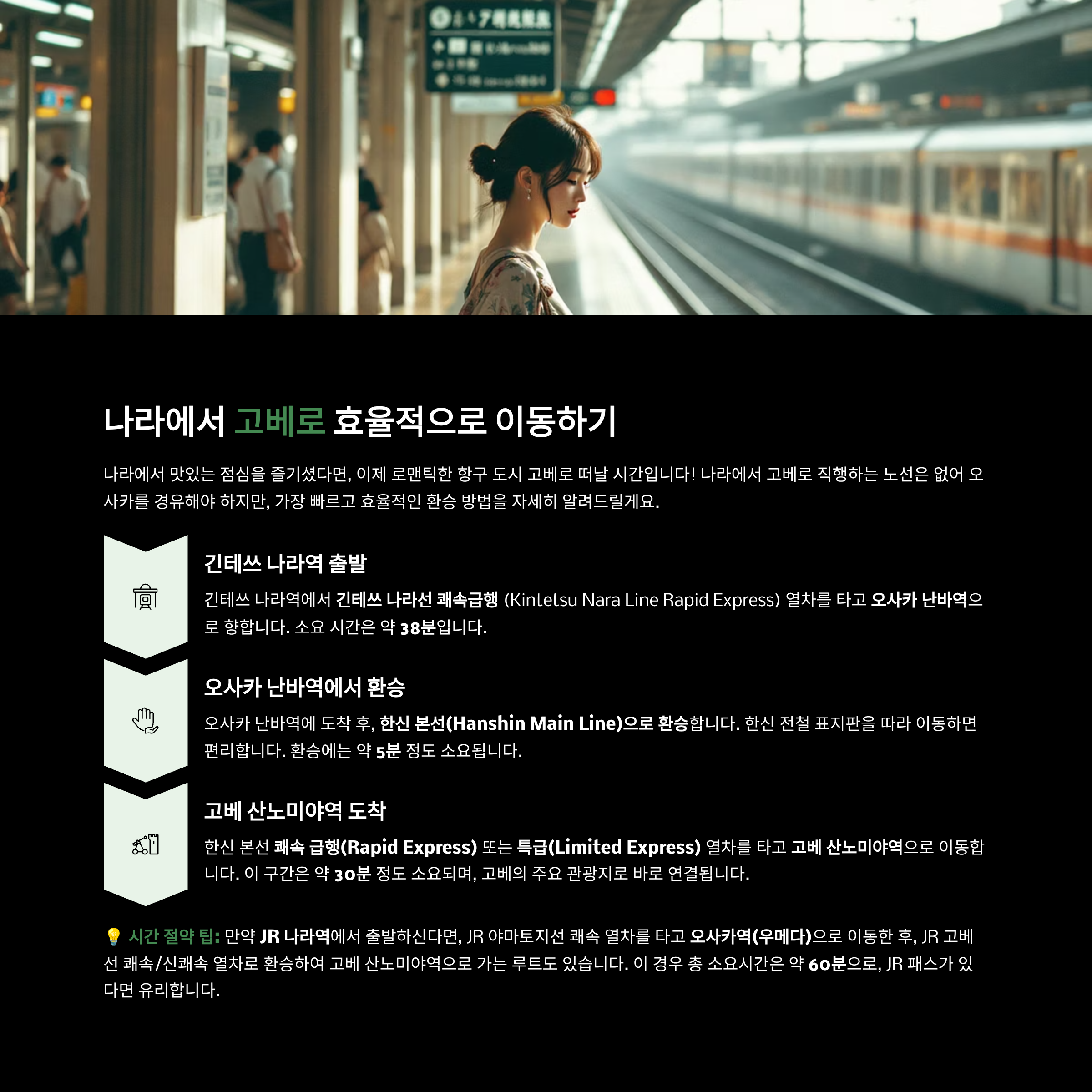 나라에서 고베로 갈 때는 오사카를 경유해야 해요. 효율적인 이동을 위해 '한신' 또는 'JR' 노선을 미리 확인하는 것이 좋아요.