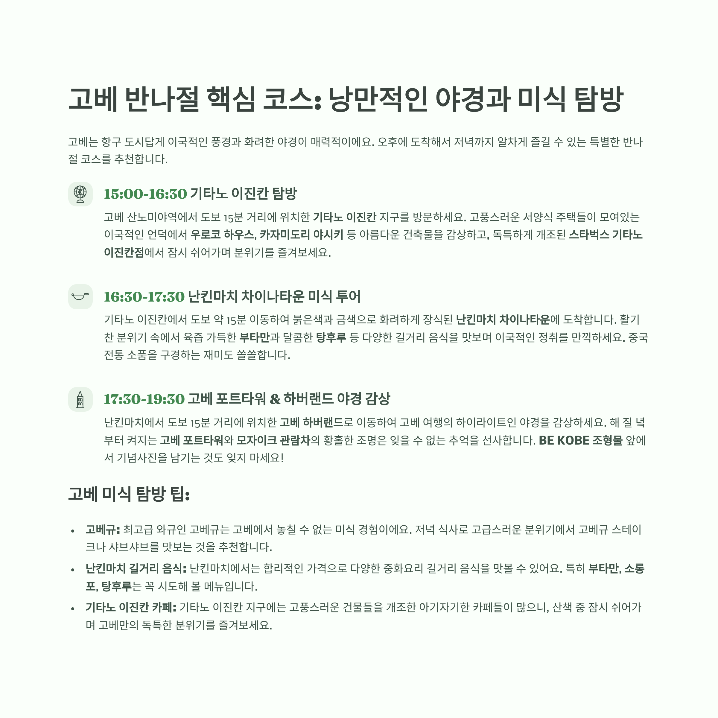 고베는 항구 도시답게 이국적인 풍경과 화려한 야경이 매력적이에요. 오후에 도착해서 저녁까지 알차게 즐길 수 있는 코스를 추천해요.