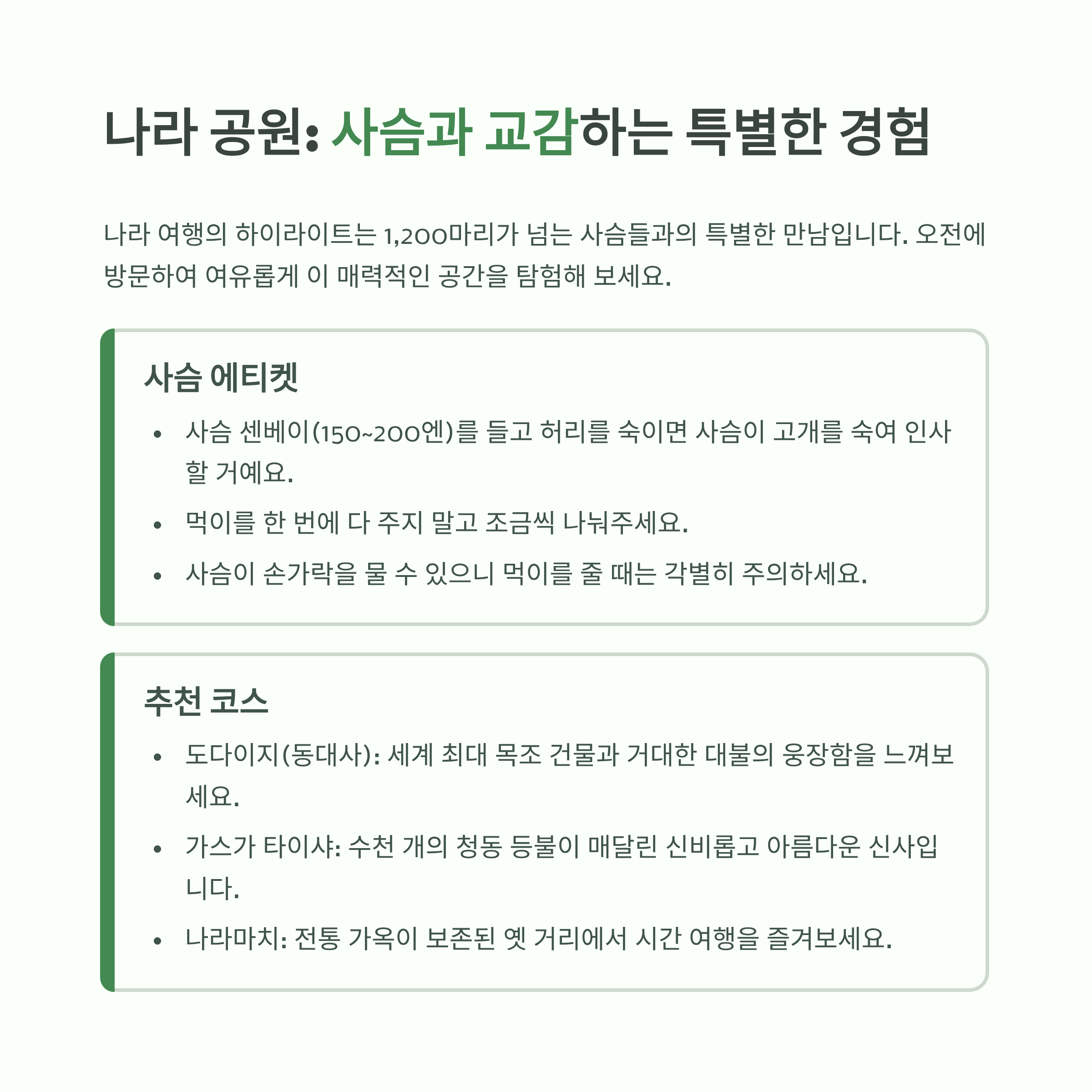나라 여행의 하이라이트는 단연 사슴과 함께하는 나라 공원과 동대사예요. 오전에 오사카에서 출발해 점심까지 나라를 둘러보는 반나절 코스를 추천해요.