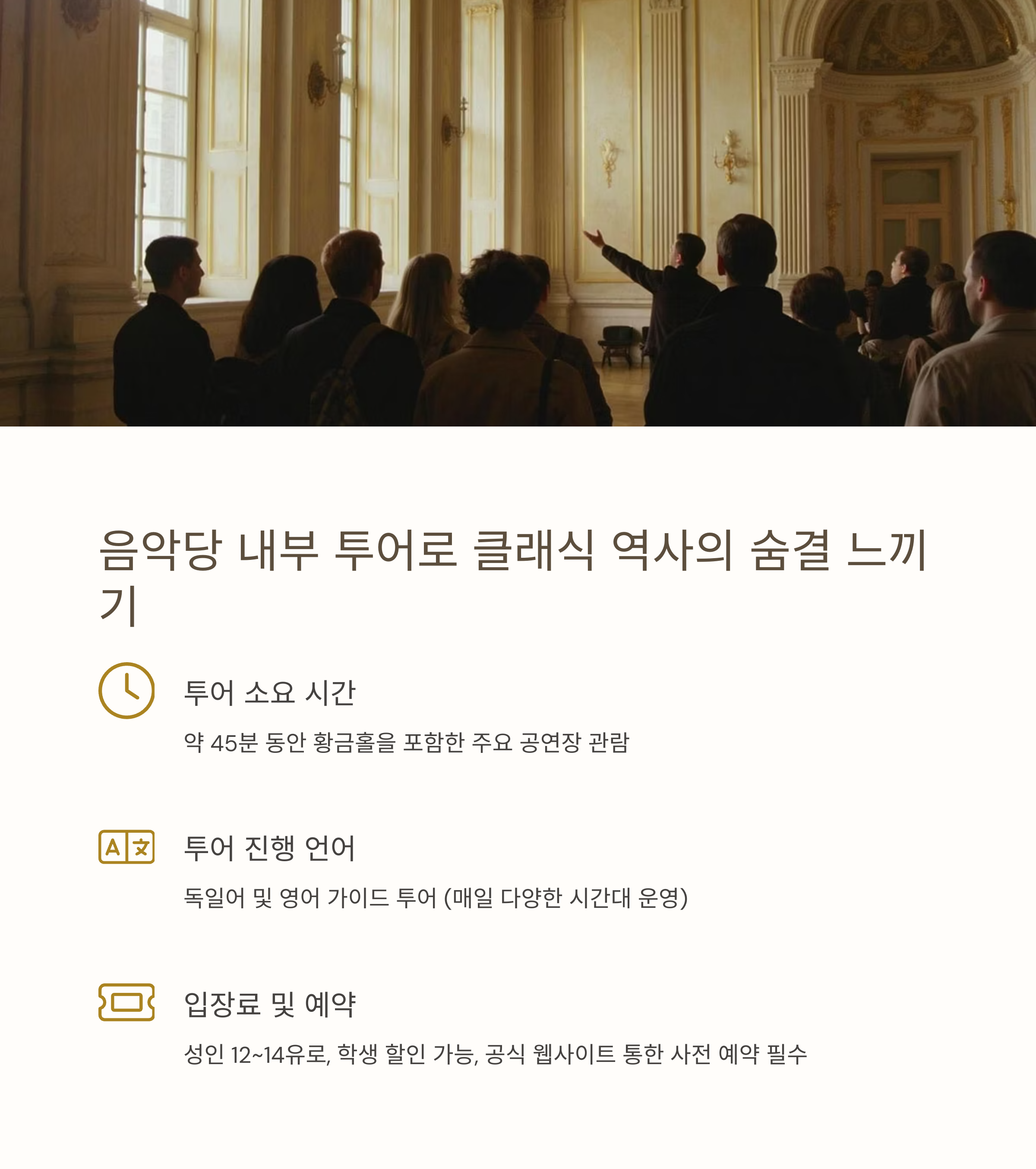 공연장 내부 투어로 황금홀을 둘러보는 것도 추천돼요.