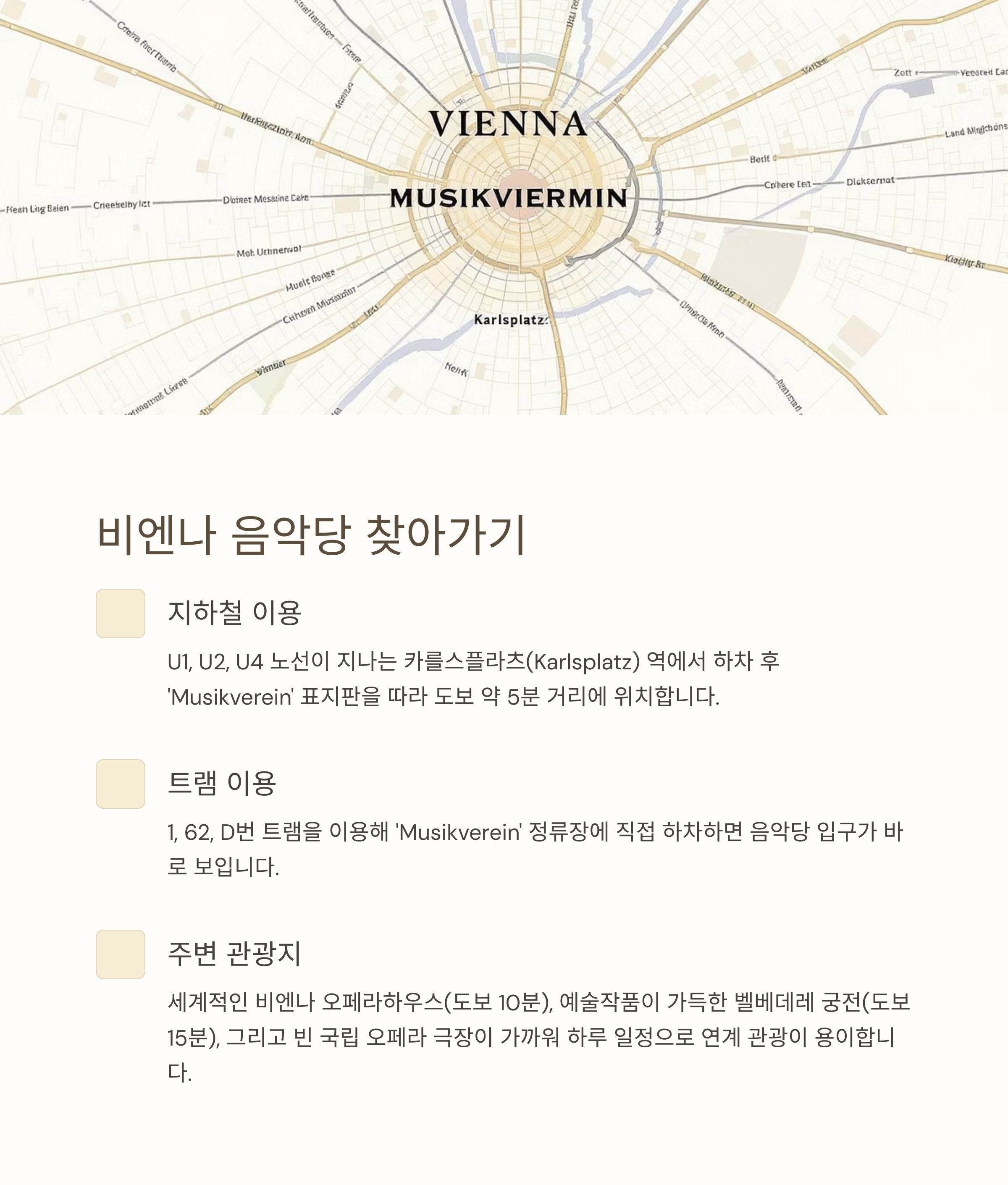 음악당은 카를스플라츠(Karlsplatz) 역에서 도보 5분 거리에 위치해 있어요.
