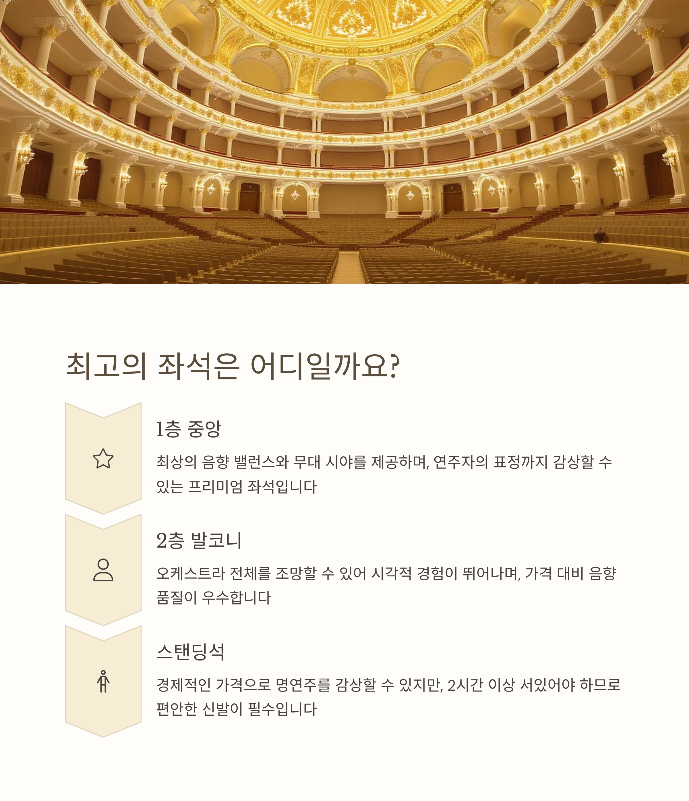 | 1층 중앙 | 음향과 시야 모두 최고, 가장 인기 |