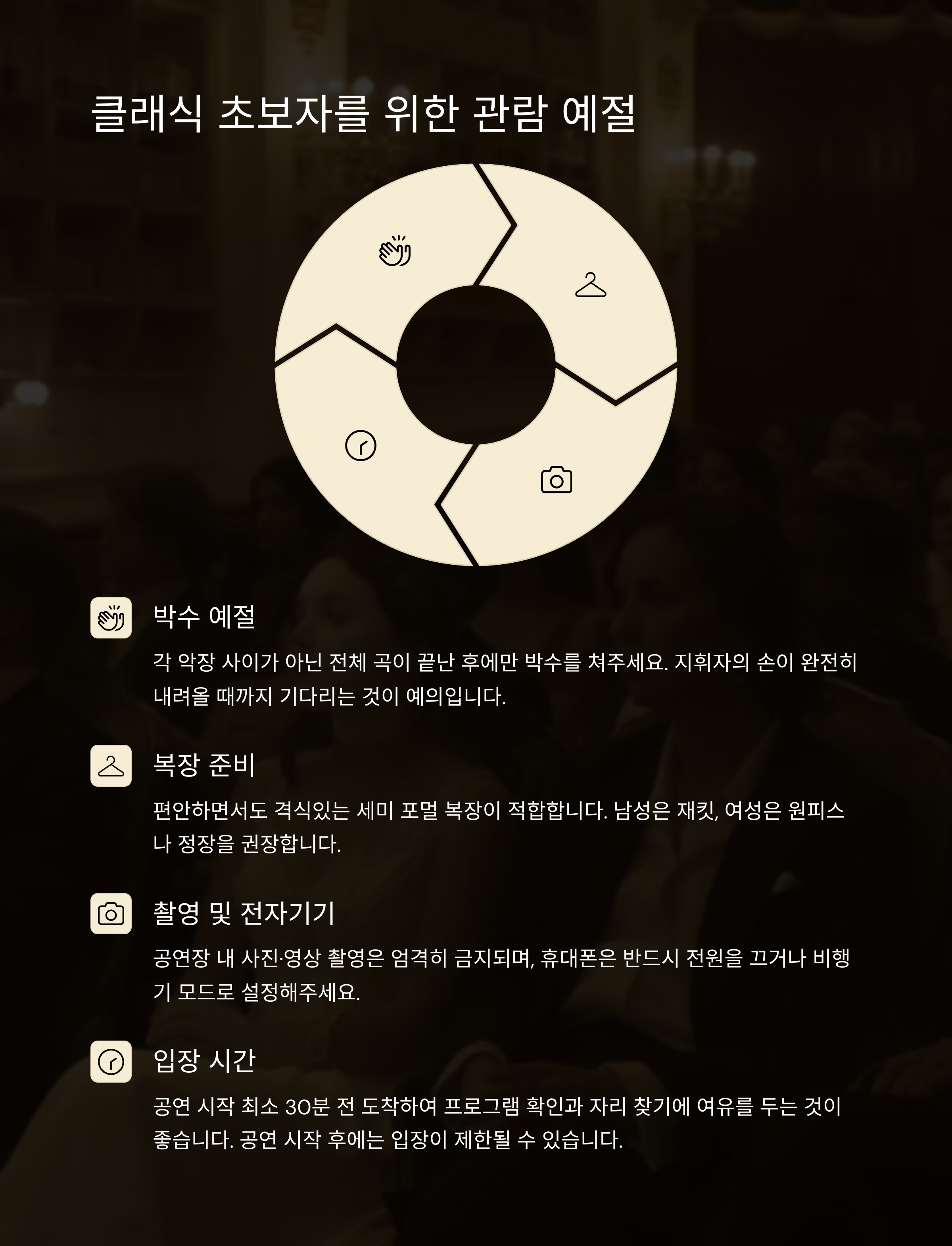 | 박수 예절 | 곡 중간엔 박수 금지, 전곡 끝난 뒤 박수 |