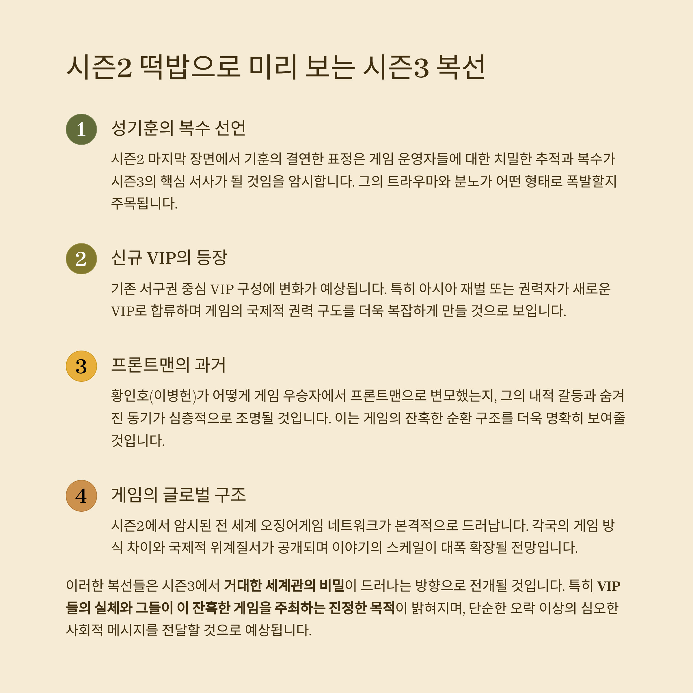 오징어게임 시즌3는 지금까지의 복선을 완전히 해소할 마지막 퍼즐이 될 수 있어요.
