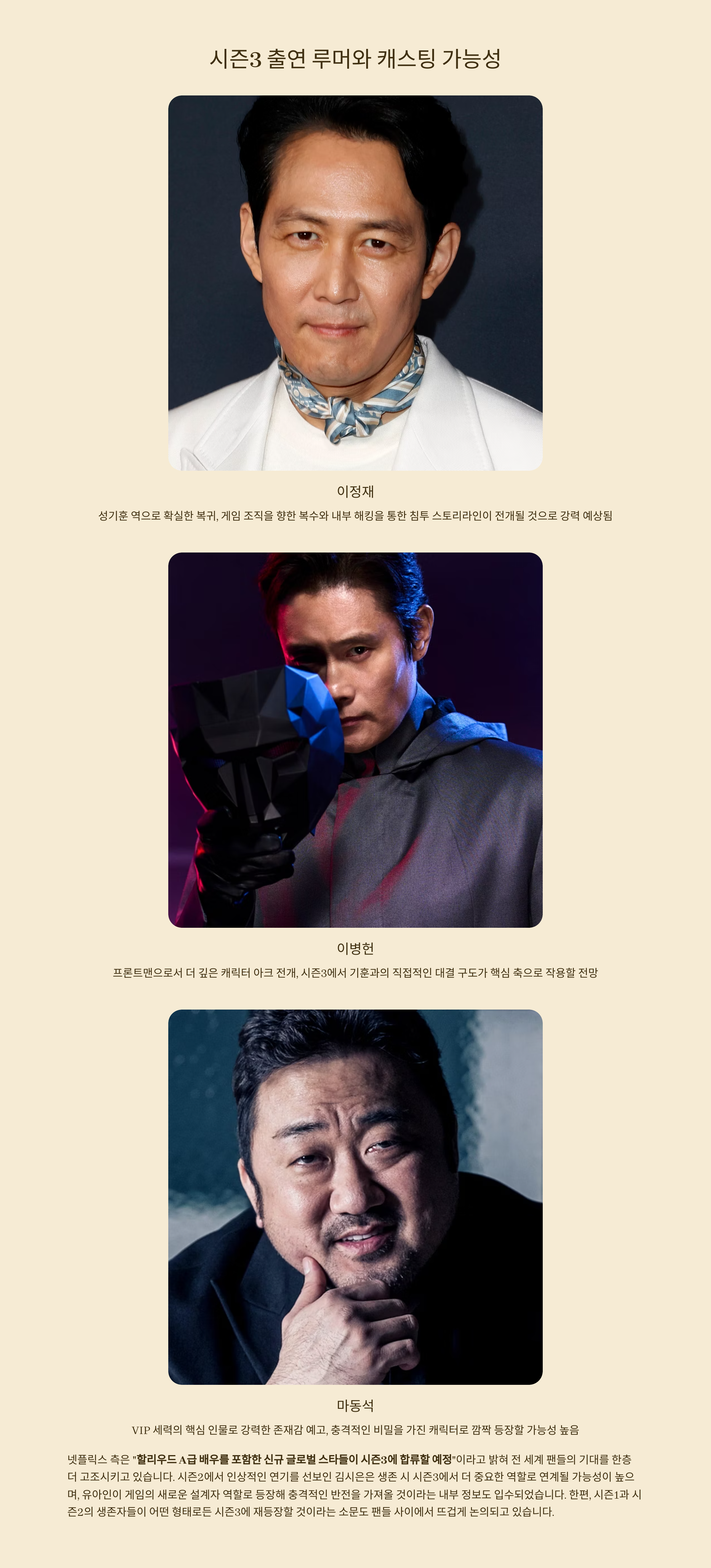 | 주연 | 이정재(성기훈) 복귀 확정, 일부 캐릭터 시즌2로부터 연계 |
