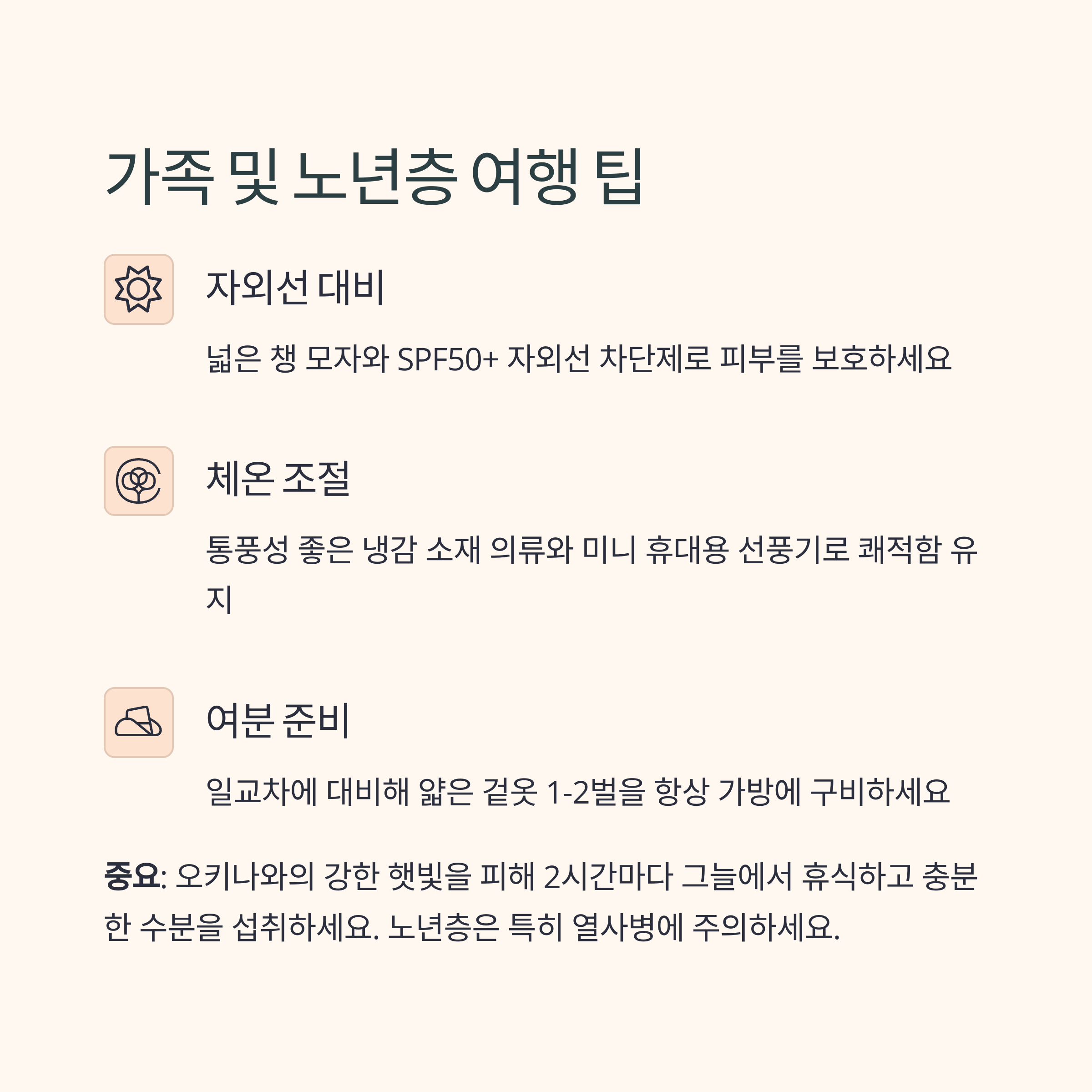 여름 (5~9월) | 반팔 + 반바지 | 자외선차단제, 모자, 썬글라스 |