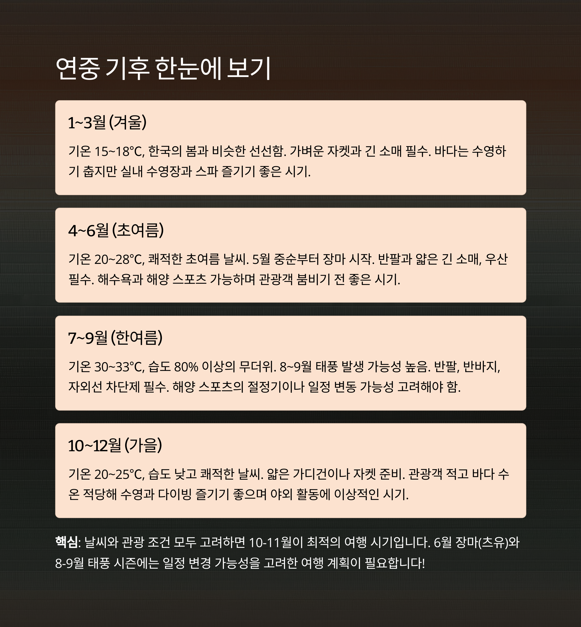 핵심: 10~11월이 가장 여행하기 좋은 시기이며6월 장마와 8~9월 태풍 시즌은 유의해야 합니다.