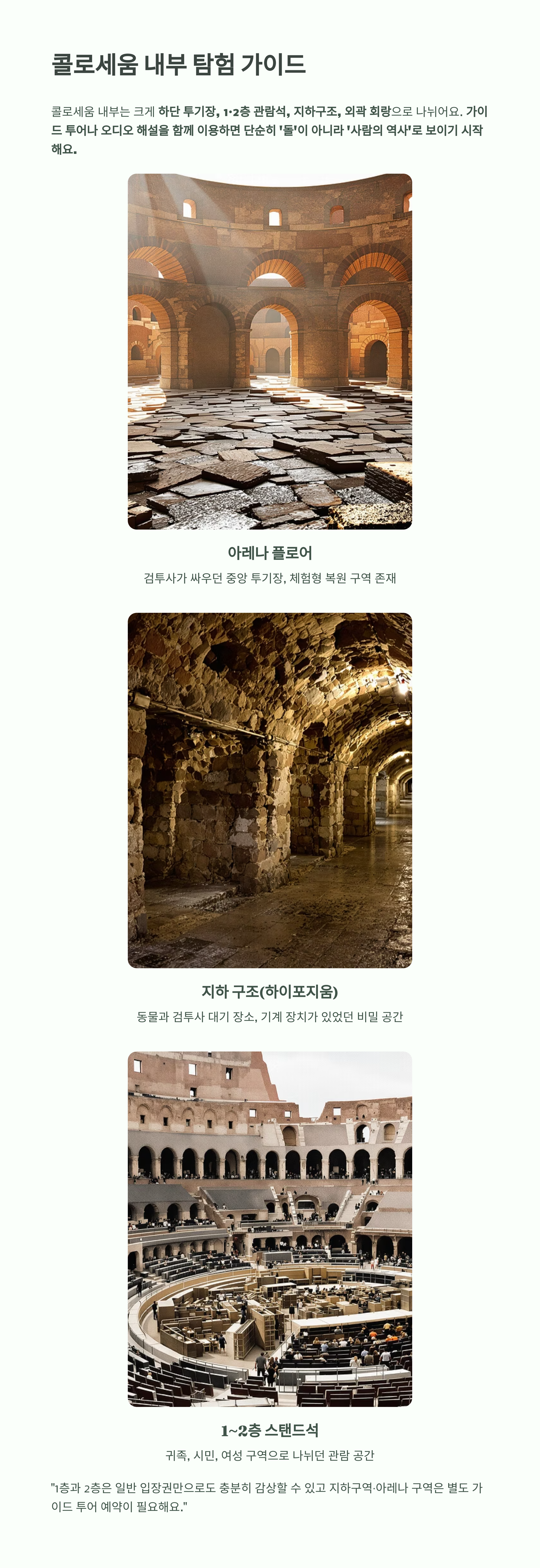콜로세움 내부는 크게 하단 투기장, 1·2층 관람석, 지하구조, 외곽 회랑으로 나뉘어요.