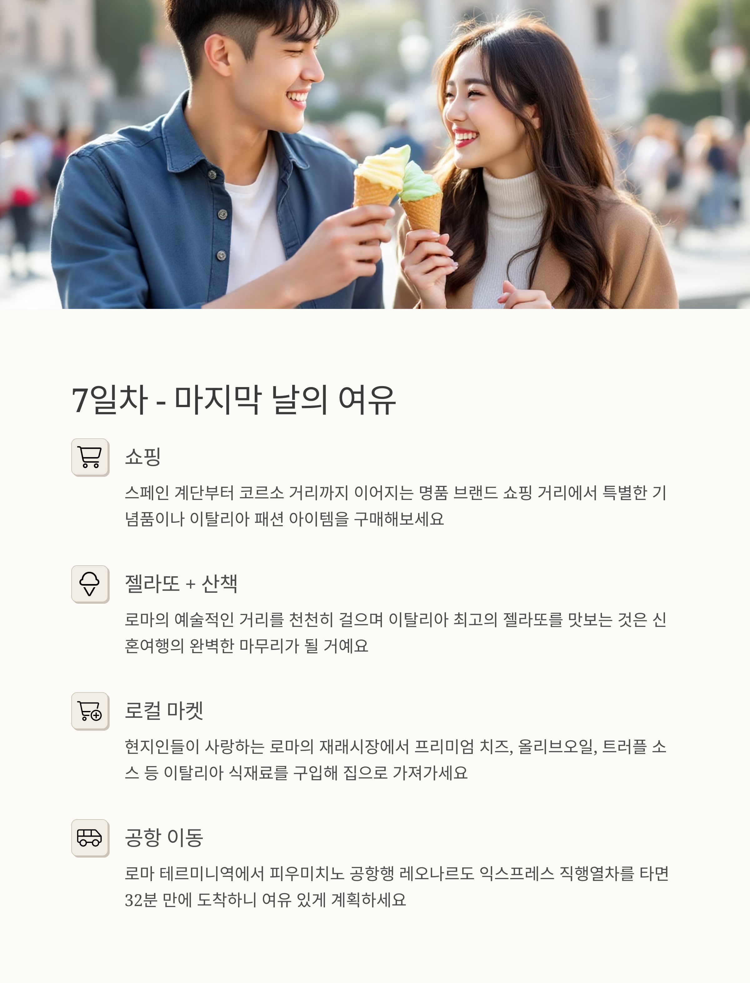 | 7일차 | 로마 | 쇼핑 & 귀국 준비 |