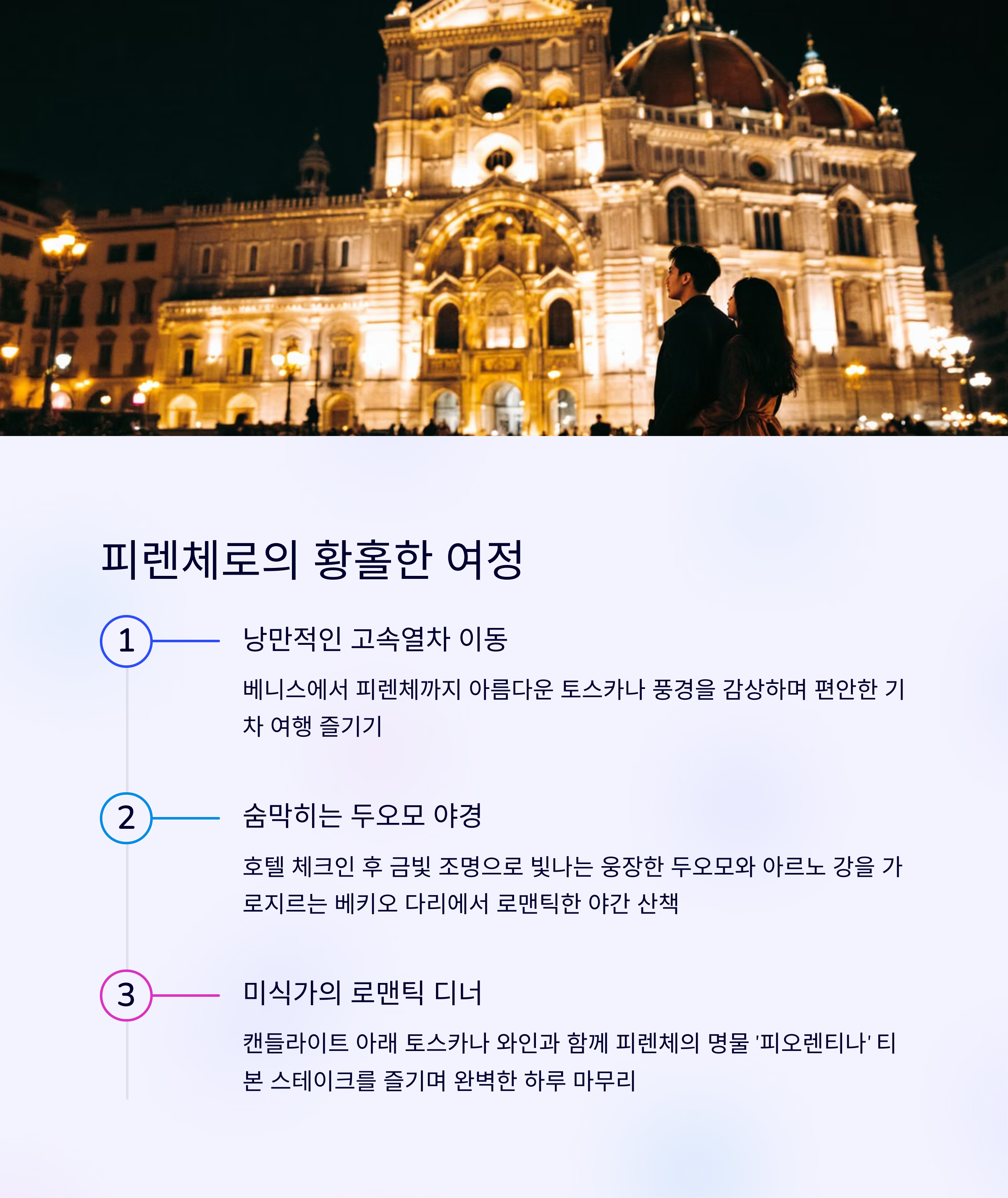 그중에서도 베니스·피렌체·로마는 신혼부부가 가장 많이 찾는 여행지예요.