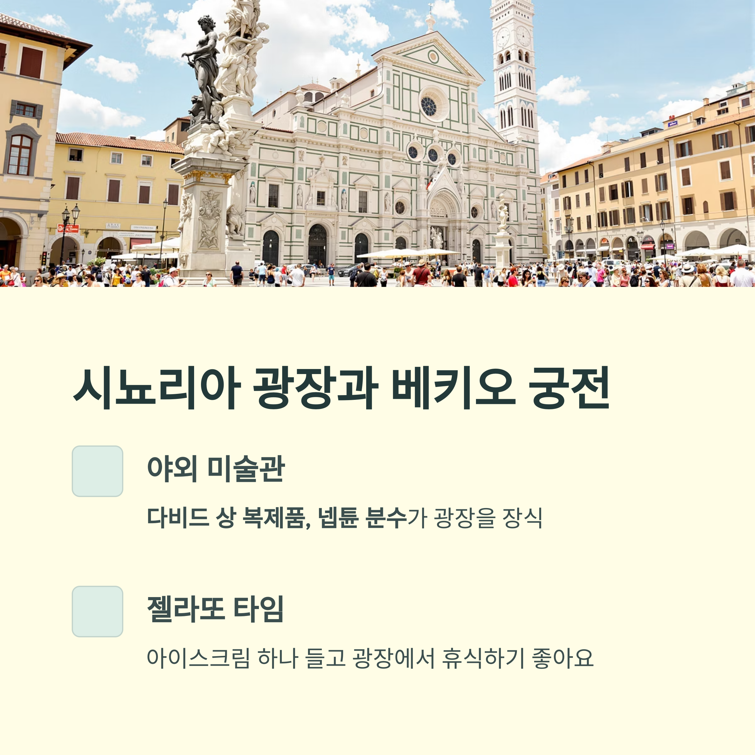 2. 시뇨리아 광장과 베키오 궁전 – 예술이 거리 위에 있어요