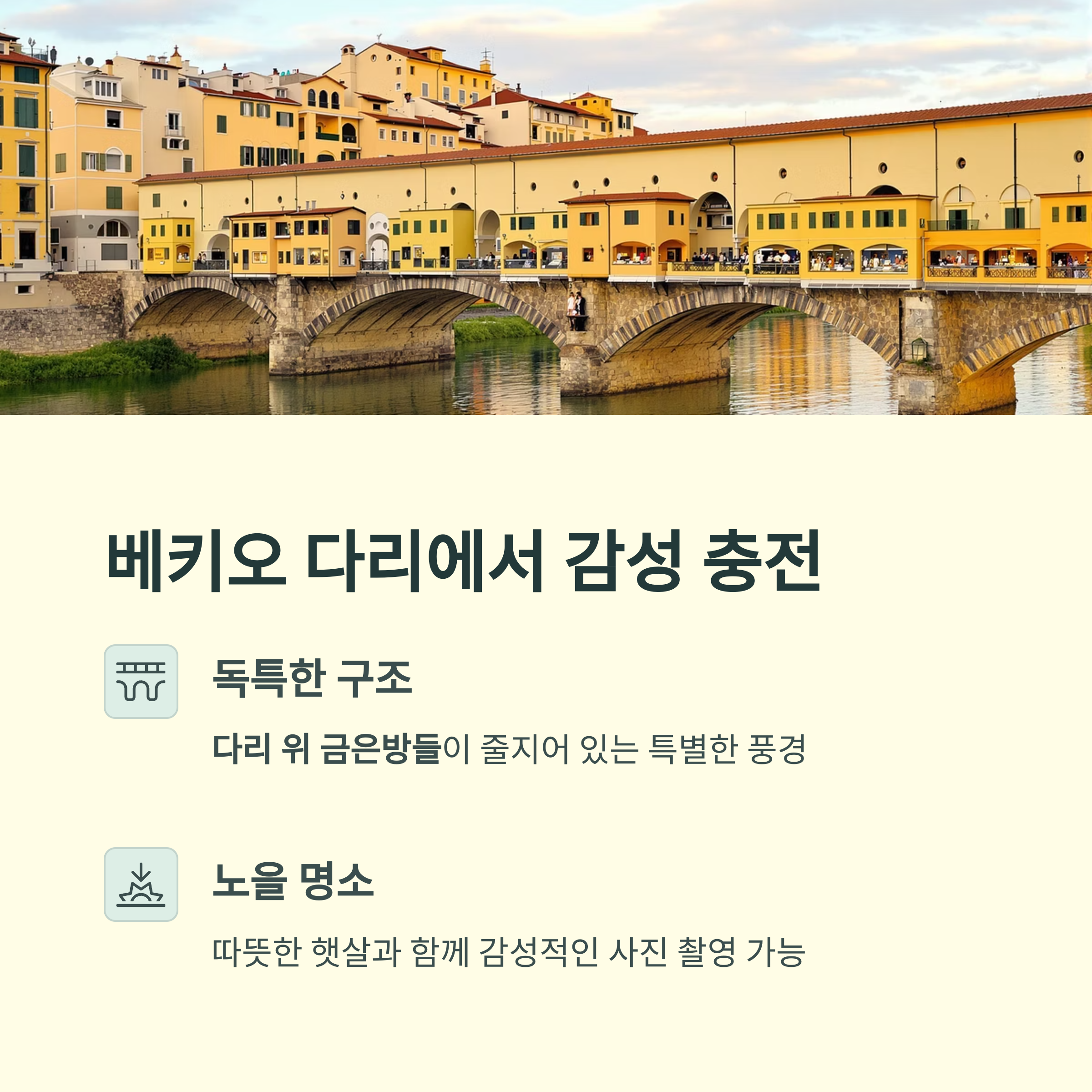피렌체에서 가장 유명한 다리, 바로 **베키오 다리(Ponte Vecchio)**예요.