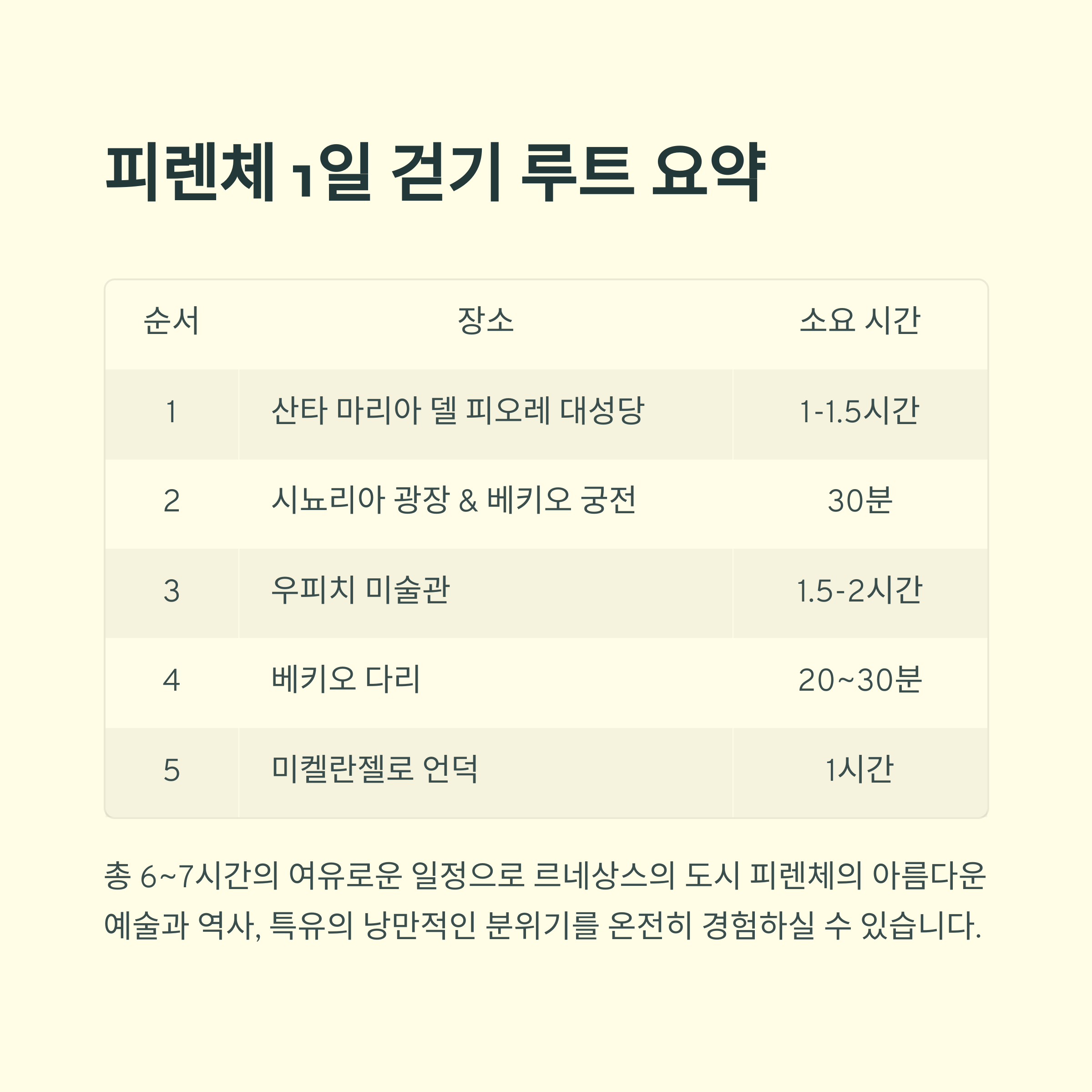 | 1 | 산타 마리아 델 피오레 대성당 | 1~1.5시간 |