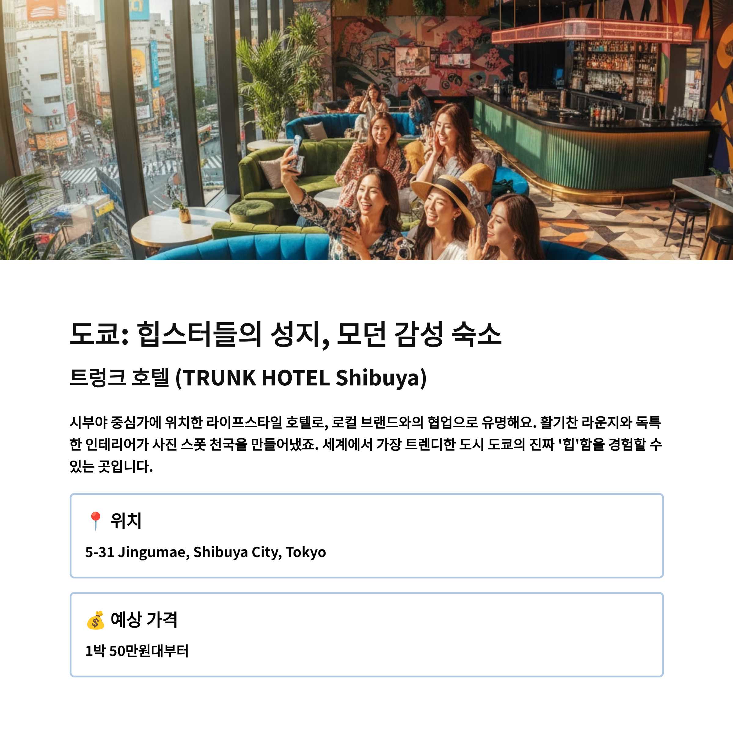 시부야 중심의 라이프스타일 호텔. 로컬 브랜드 협업과 활기찬 라운지로 유명해 사진 스폿이 가득합니다.