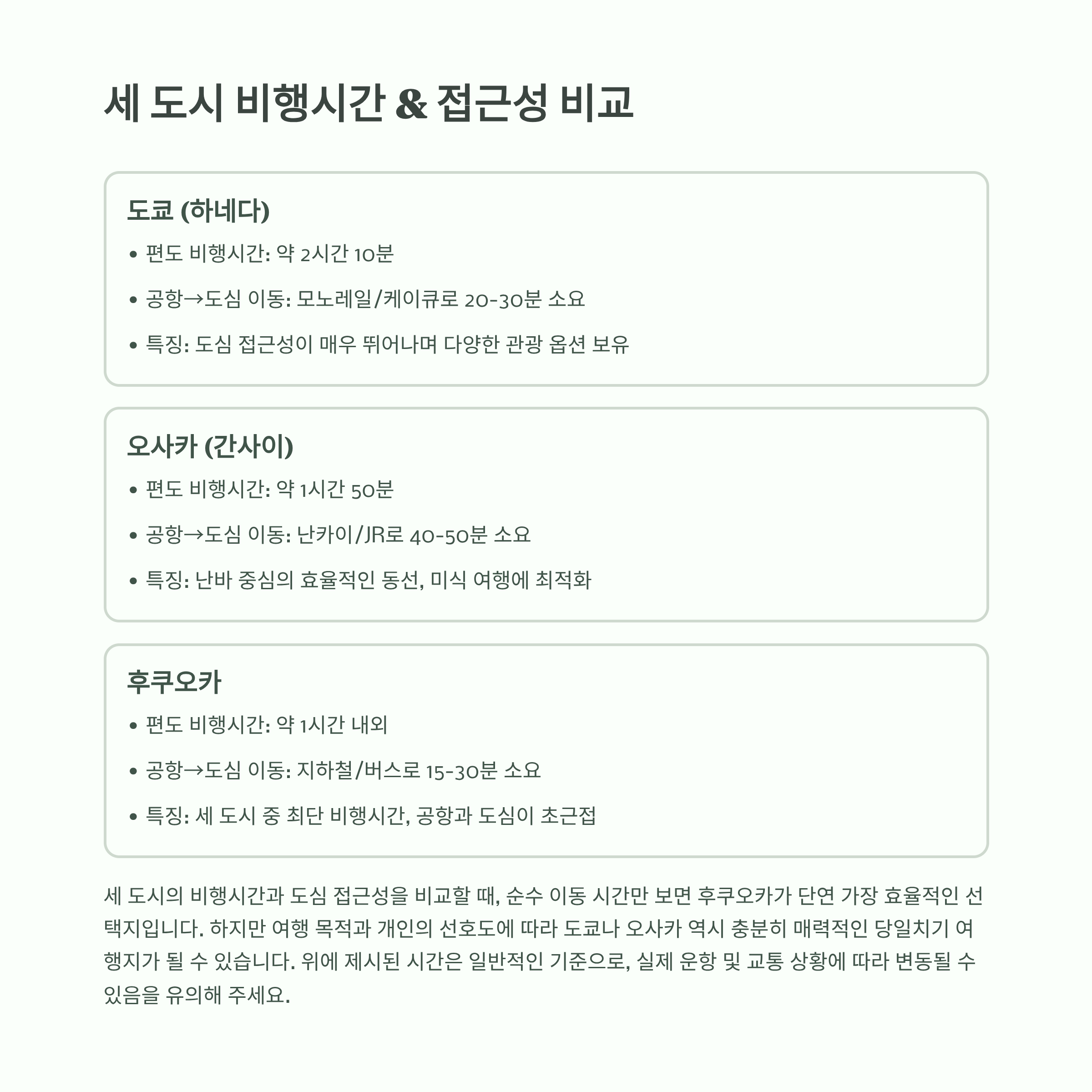 | 후쿠오카 | ~1시간대 | 지하철/버스 15~30분 | 최단 비행·근접 |
