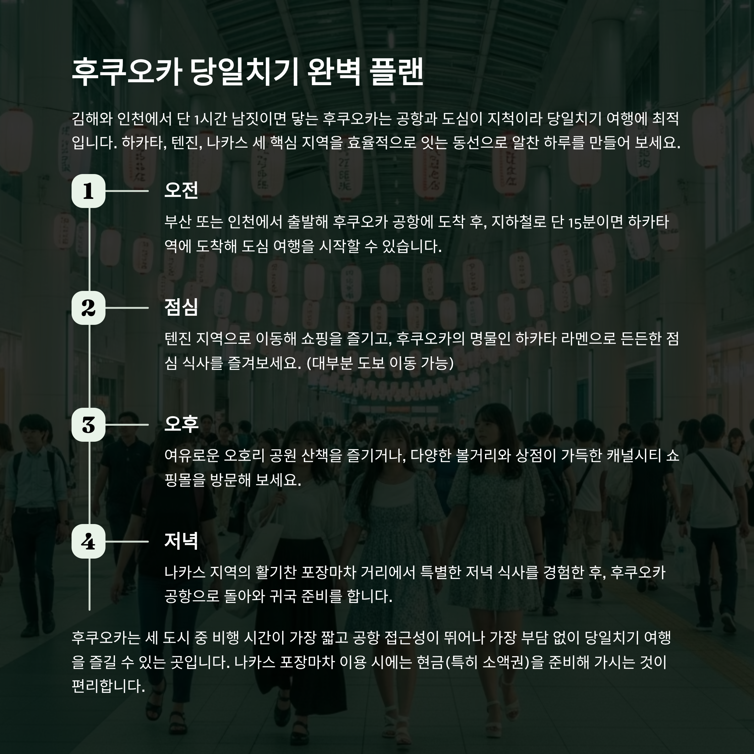 | 저녁 | 나카스 포장마차 → 공항 | 현금 소액 권장 |
