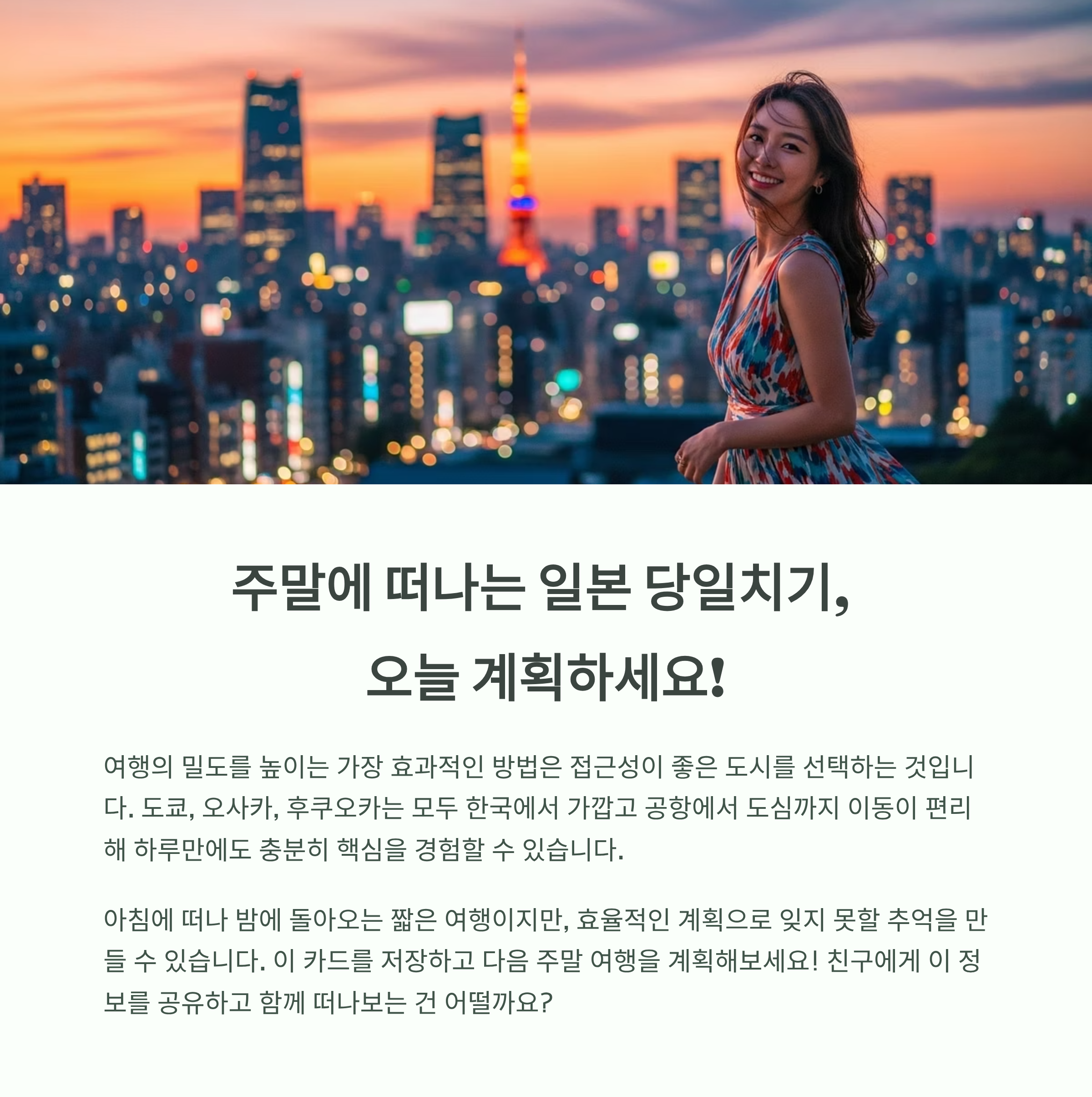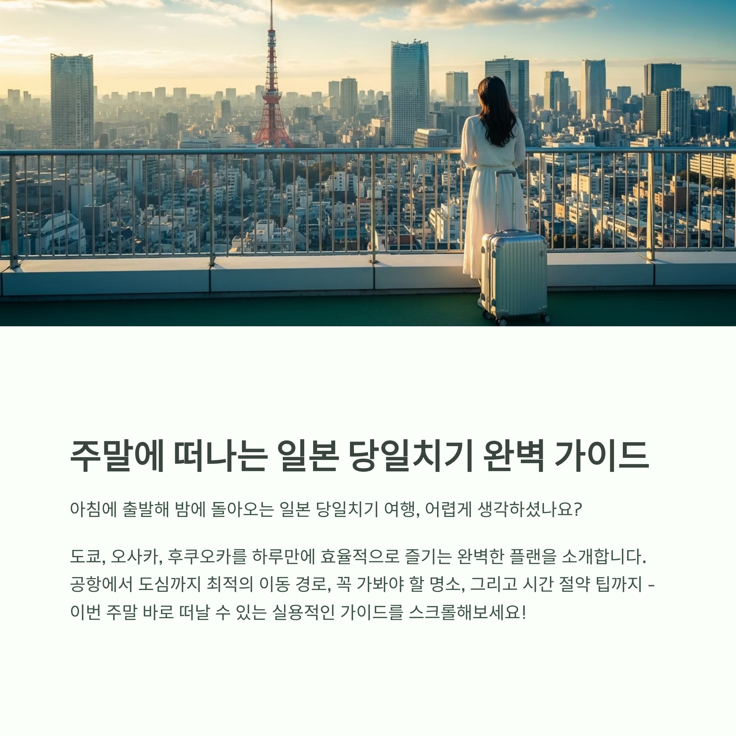가장 많은 문의를 받는 일본 당일치기를 도쿄·오사카·후쿠오카 3도시로 압축 정리했습니다.