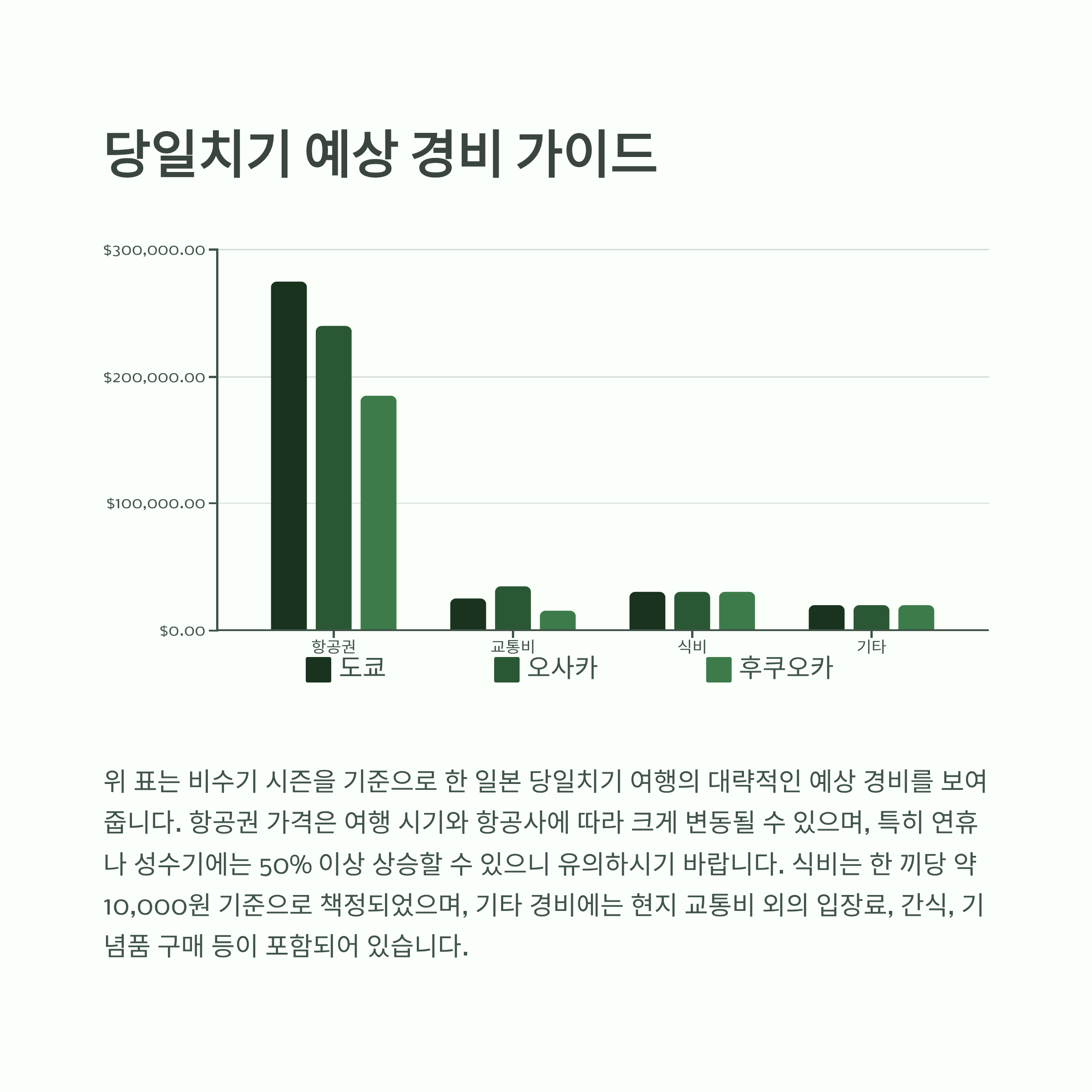 | 항공권 | 비수기 왕복 20~35만원 | 비수기 왕복 18~30만원 | 비수기 왕복 12~25만원 |