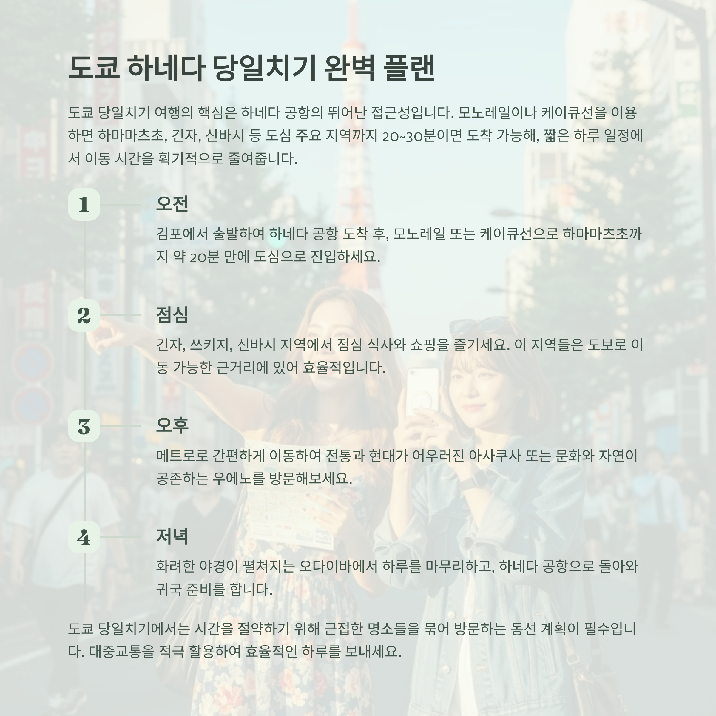 하네다는 모노레일·케이큐로 하마마츠초·긴자·신바시까지 20~30분대 진입이 가능해 동선 낭비가 적습니다. 근거리 스폿 위주로 묶으면 촘촘한 일정이 가능합니다.