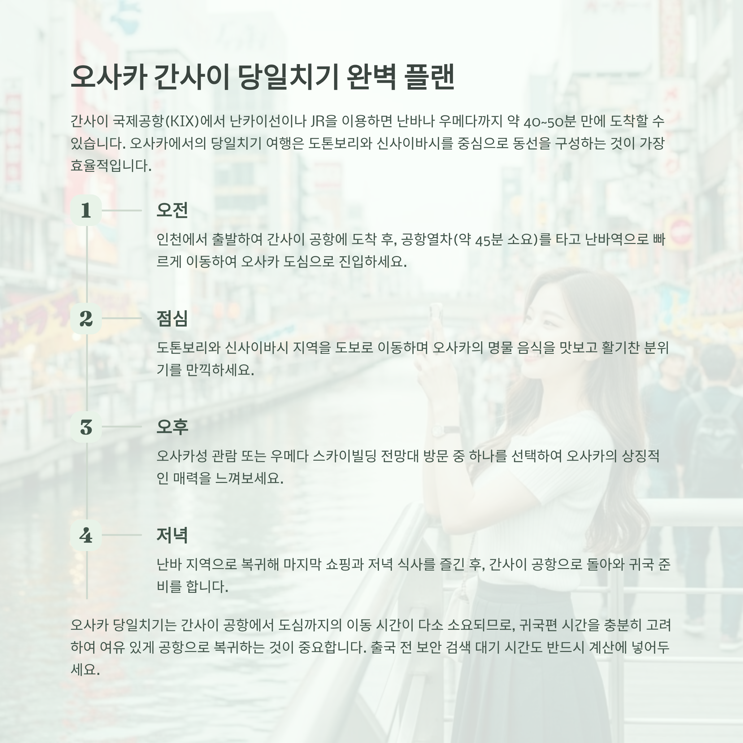 | 오사카(KIX) | ~1시간50분 | 난카이/JR 40~50분 | 난바 중심 동선 |