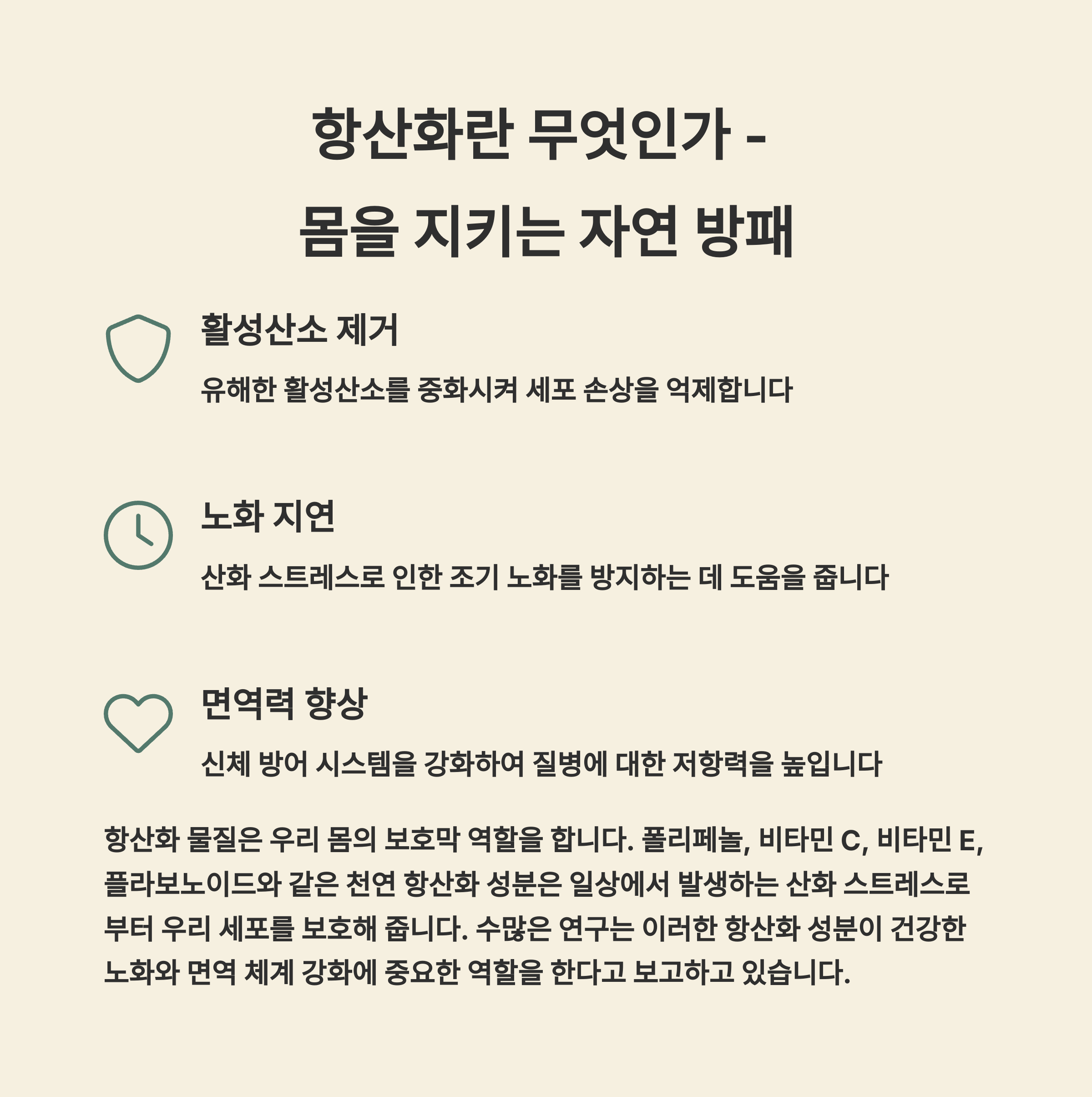 "활성산소는 노화, 염증, 질병의 원인이 되기 때문에 이를 막아주는 항산화가 필수적입니다."