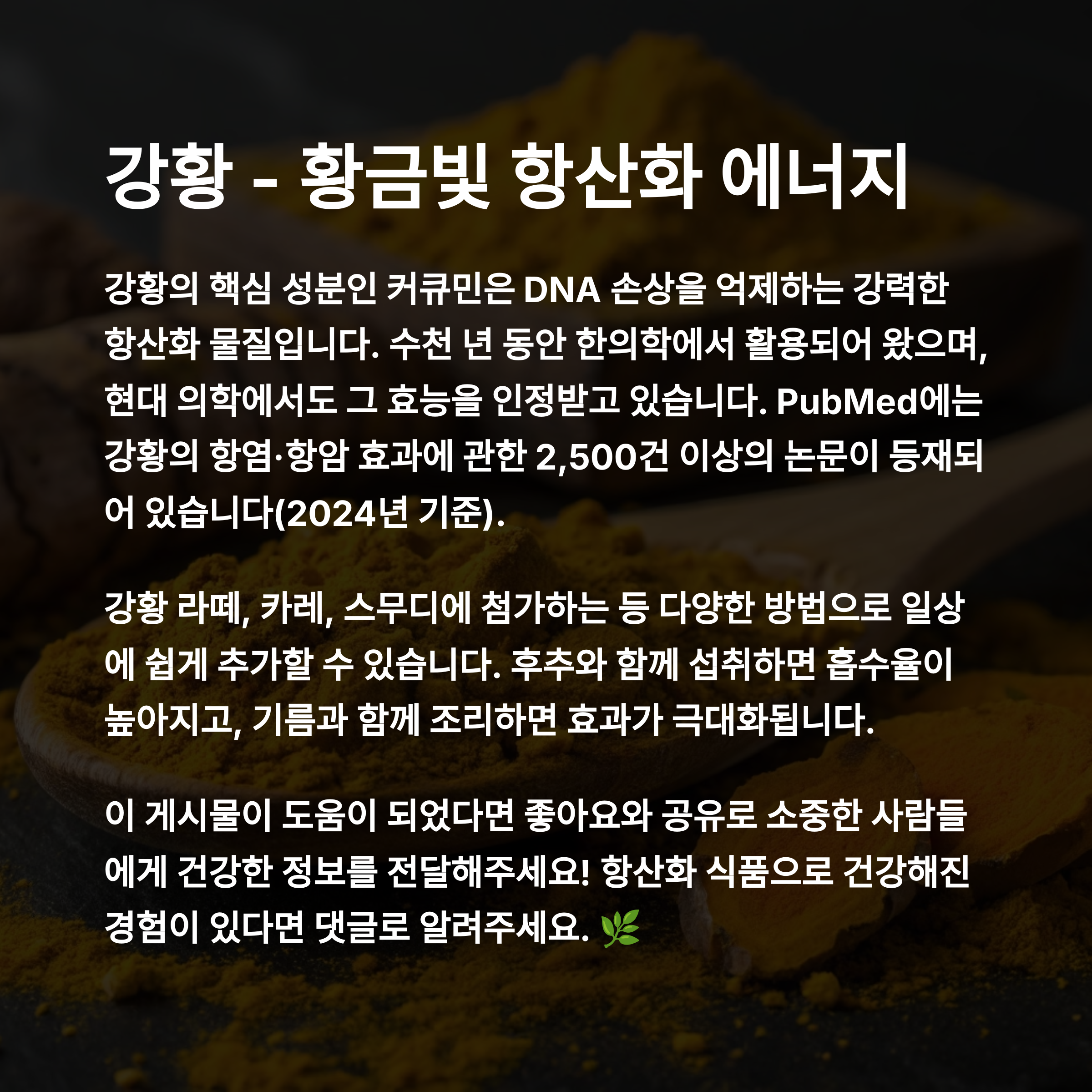 강황은 커큐민이라는 성분 덕분에 강력한 항염, 항산화 효과를 지닙니다.