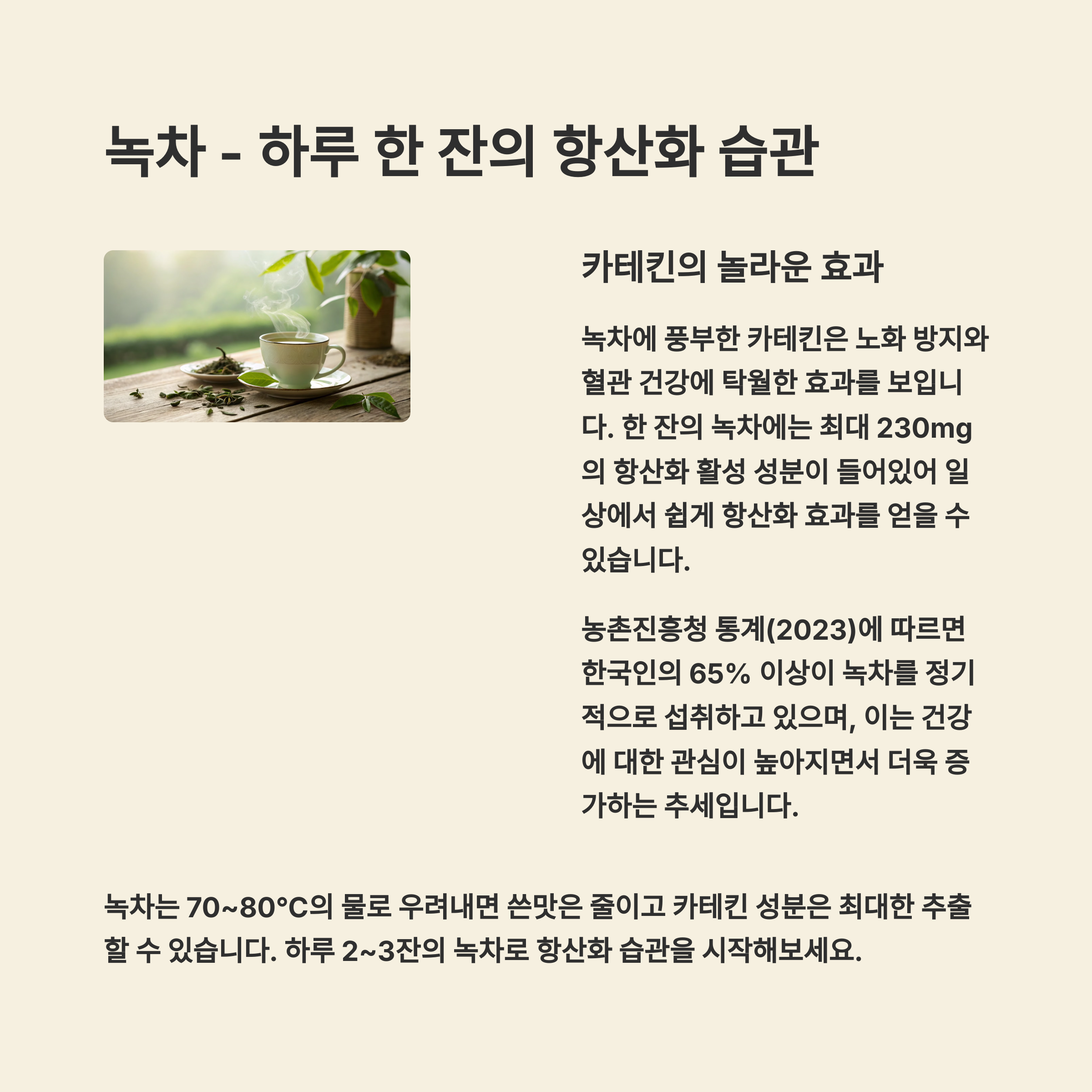 "하루 1~2잔의 녹차는 활성산소를 제거하고 면역력을 높이는 데 도움이 됩니다."