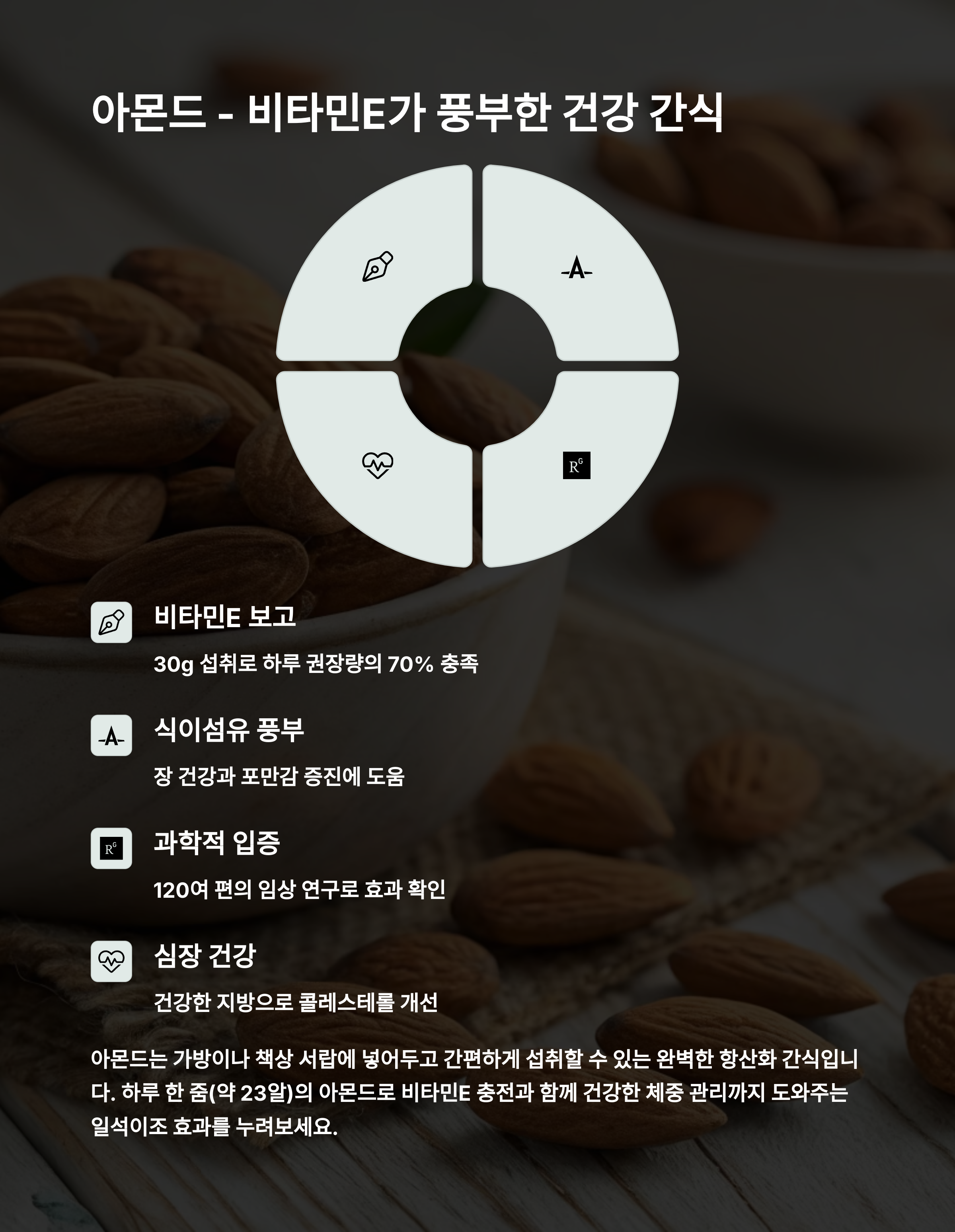 "하루 20알 정도 아몬드를 꾸준히 섭취하면 항산화 효과를 기대할 수 있습니다."