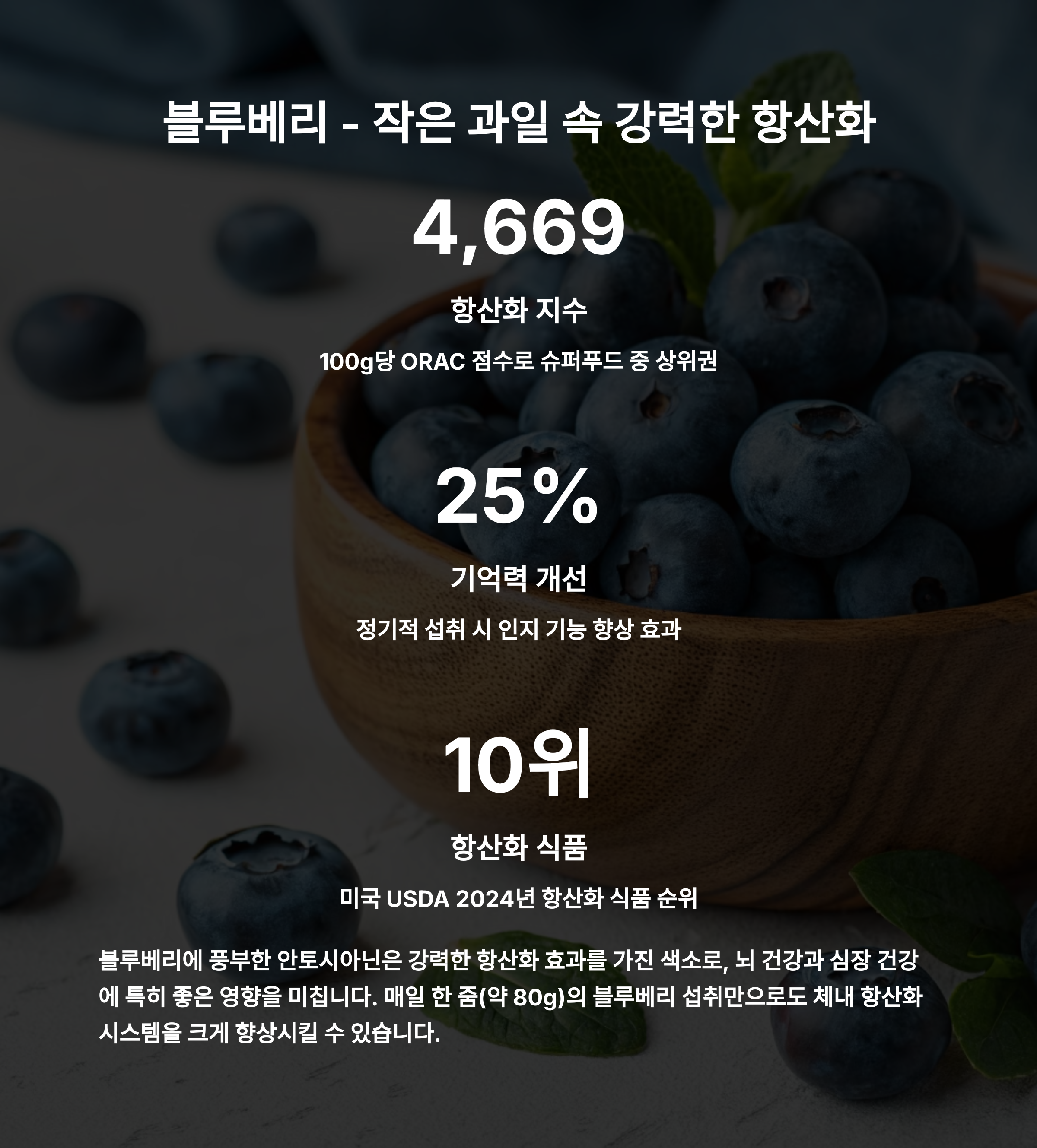 "안토시아닌이라는 강력한 항산화 물질이 눈 건강과 심혈관 건강을 돕습니다."