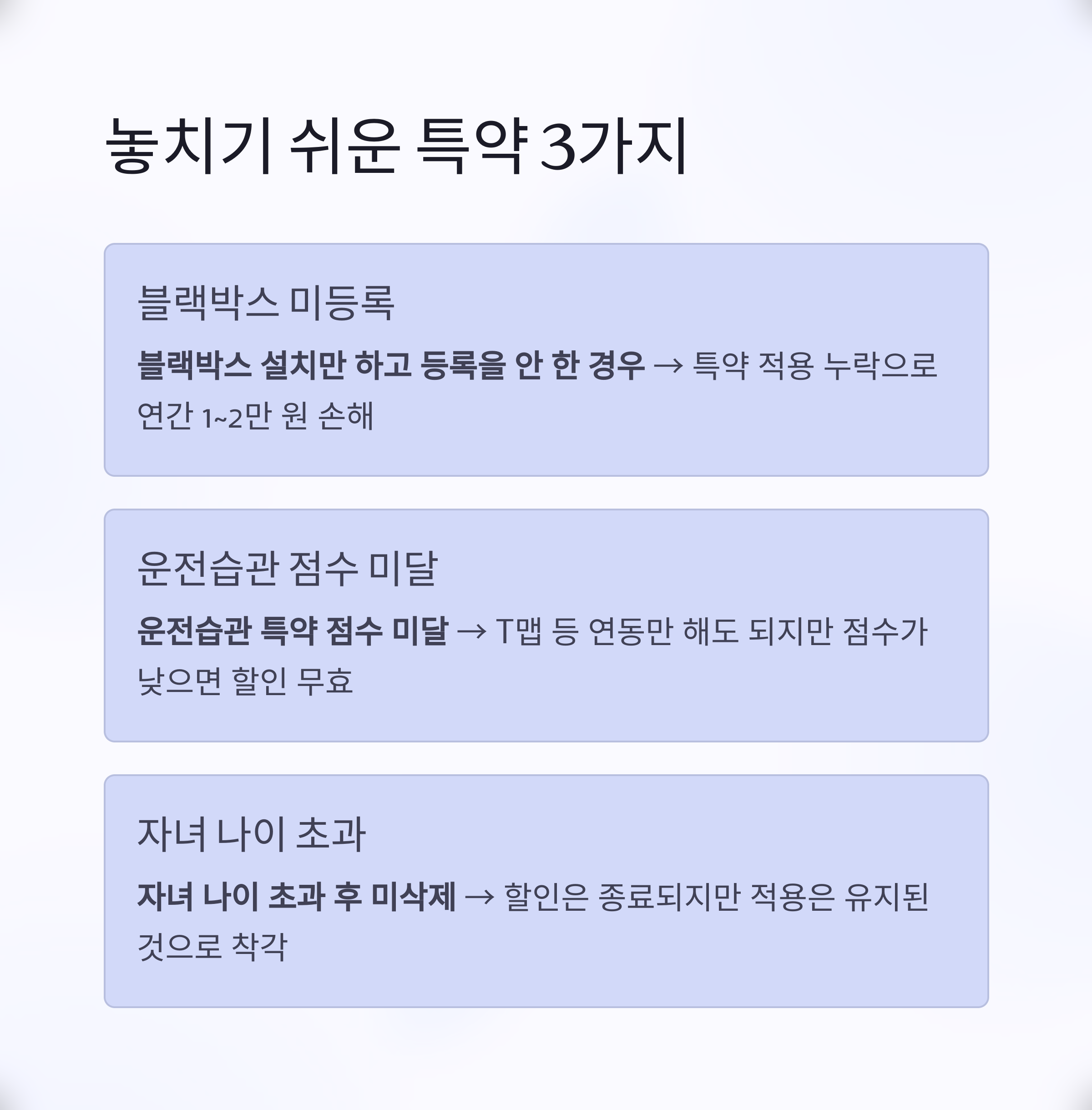 → 특약 적용 누락으로 연간 1~2만 원 손해 - 운전습관 특약 점수 미달