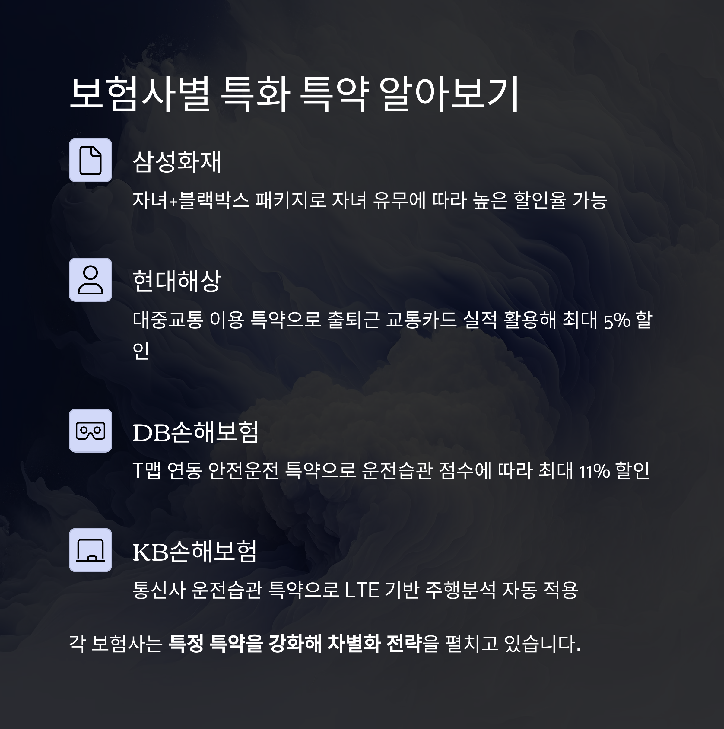 | 삼성화재 | 자녀+블랙박스 패키지 | 자녀 유무에 따라 높은 할인율 가능 |
