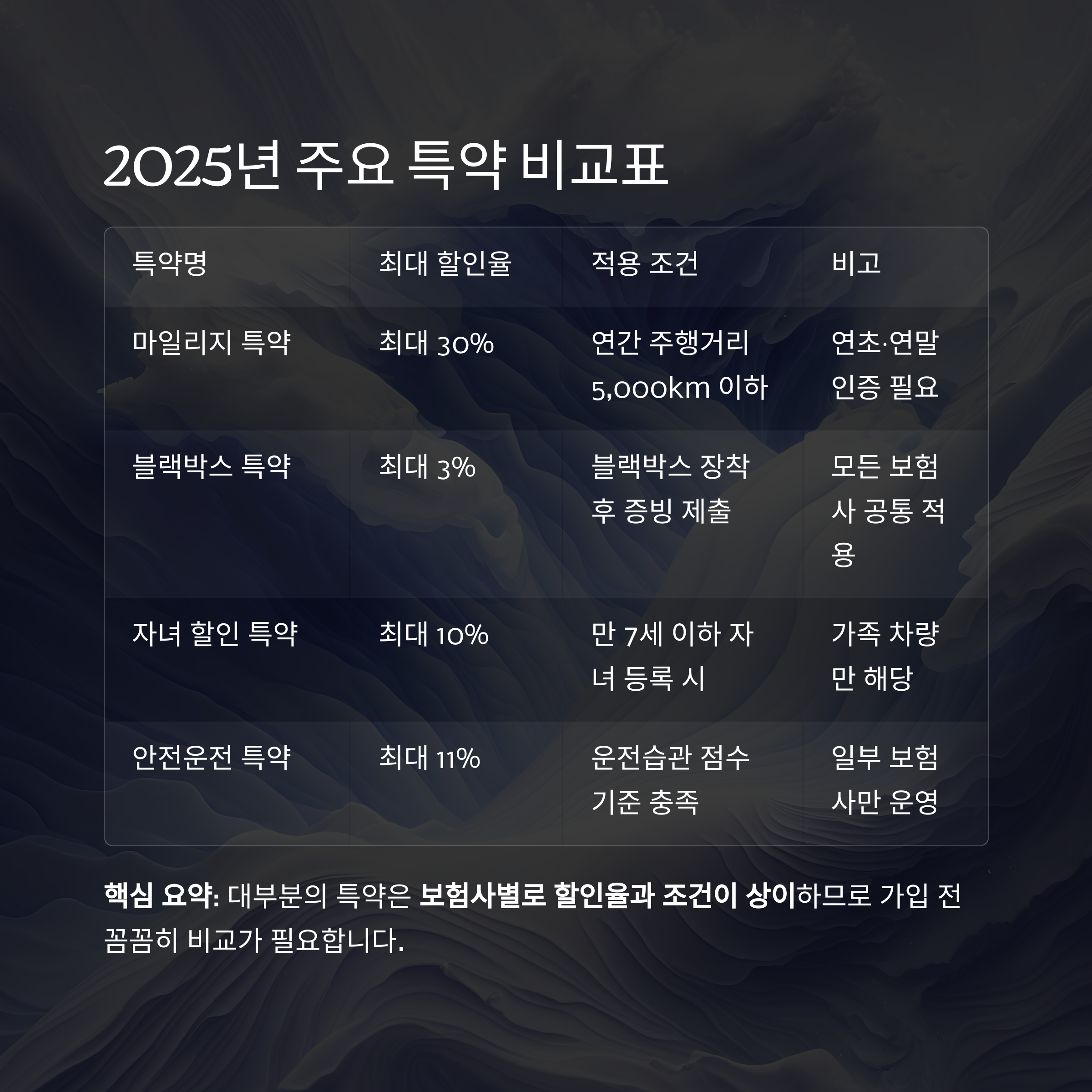 | 블랙박스 특약 | 최대 3% | 블랙박스 장착 후 증빙 제출 | 모든 보험사 공통 적용 |