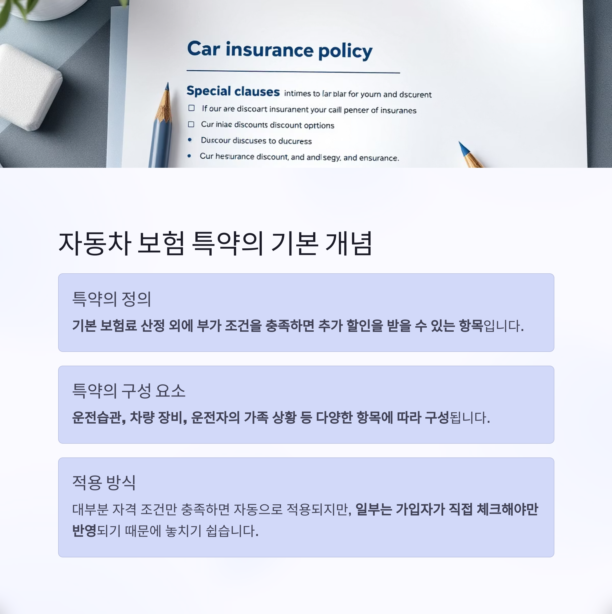 자동차 보험 특약은 기본 보험료 산정 외에 부가 조건을 충족하면 추가 할인을 받을 수 있는 항목입니다.