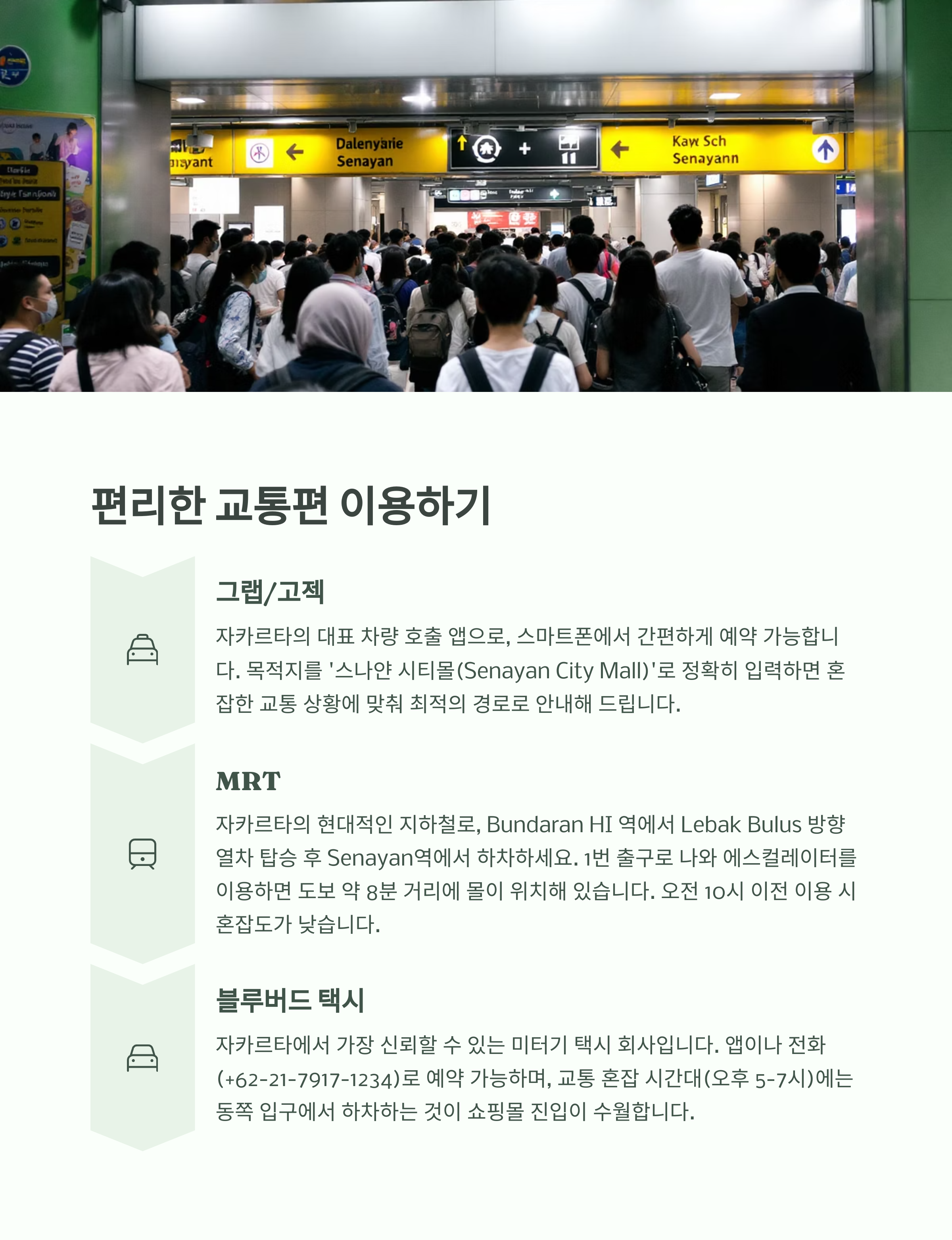 | 차량 | 그랩(Grab) 또는 고젝(Gojek) 이용 가장 편리 |