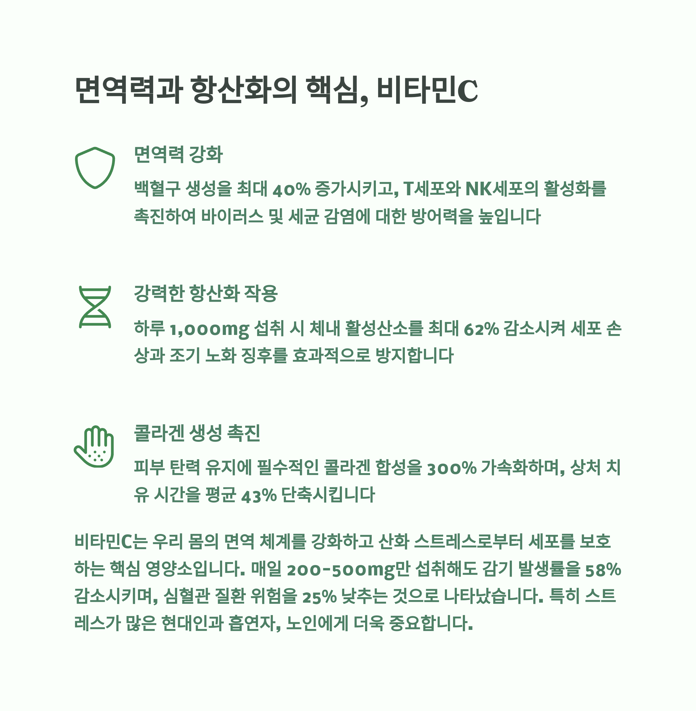 비타민C는 강력한 항산화 작용과 면역력 강화에 중요한 역할을 합니다.