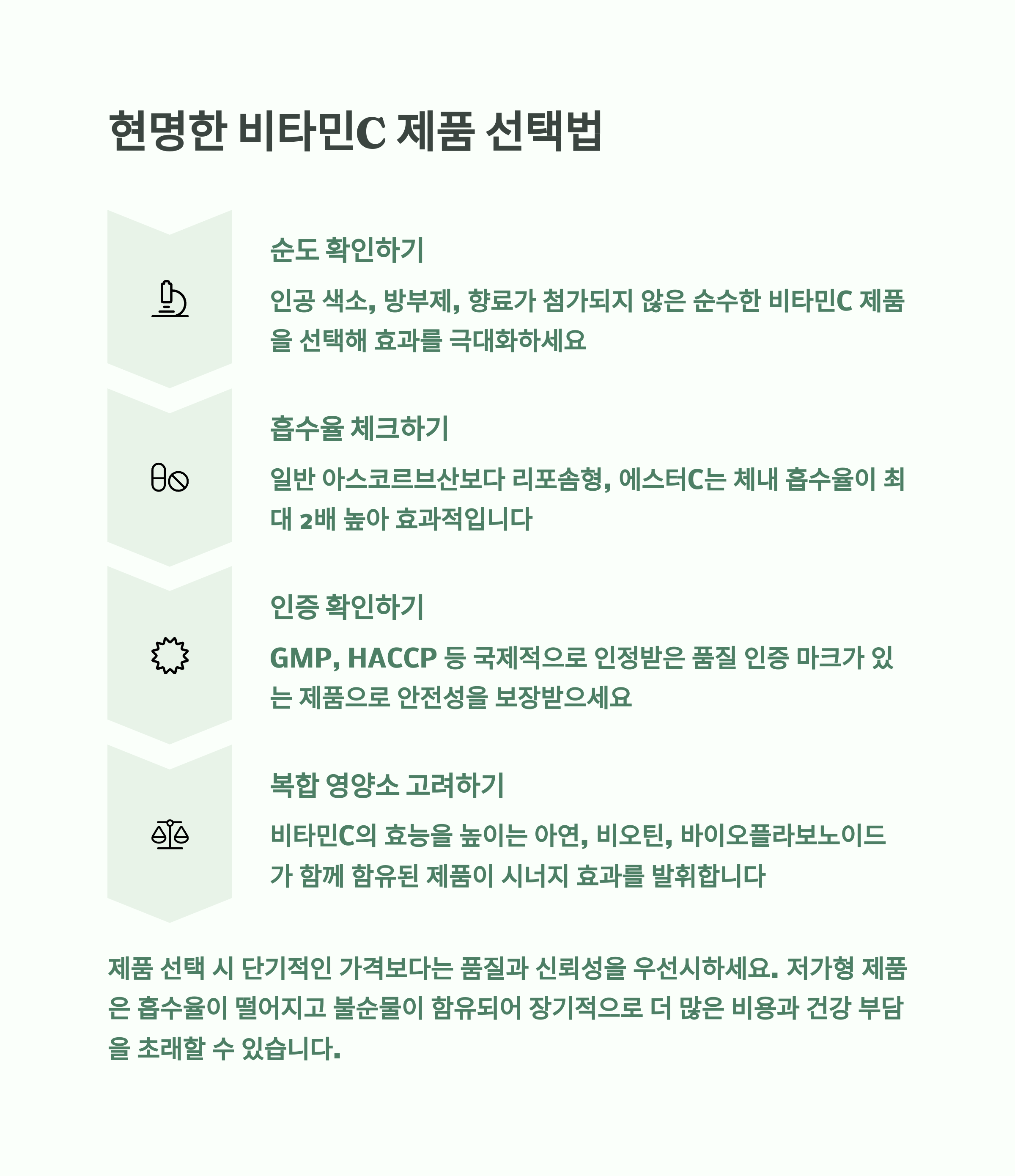 "흡수율, 부원료, 제조방식(리포좀형, 에스터C 등)을 꼼꼼히 비교하세요."