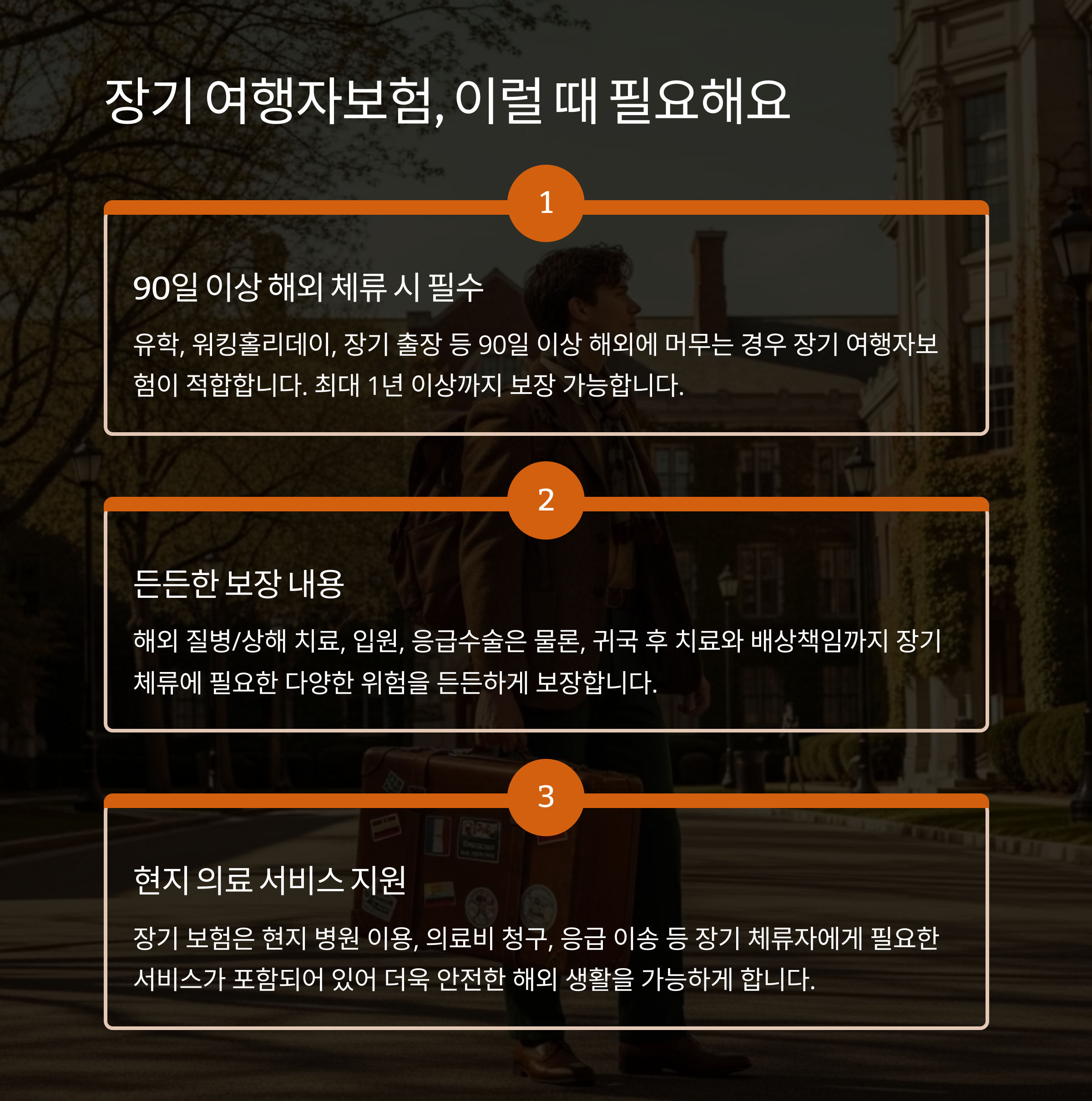 장기 여행자보험은 일반적으로 90일을 초과한 해외 체류를 위한 보험이에요. 유학생, 장기출장자, 워홀러 등 일정 기간 해외에 머무는 분들을 위한 맞춤형 보험이죠.