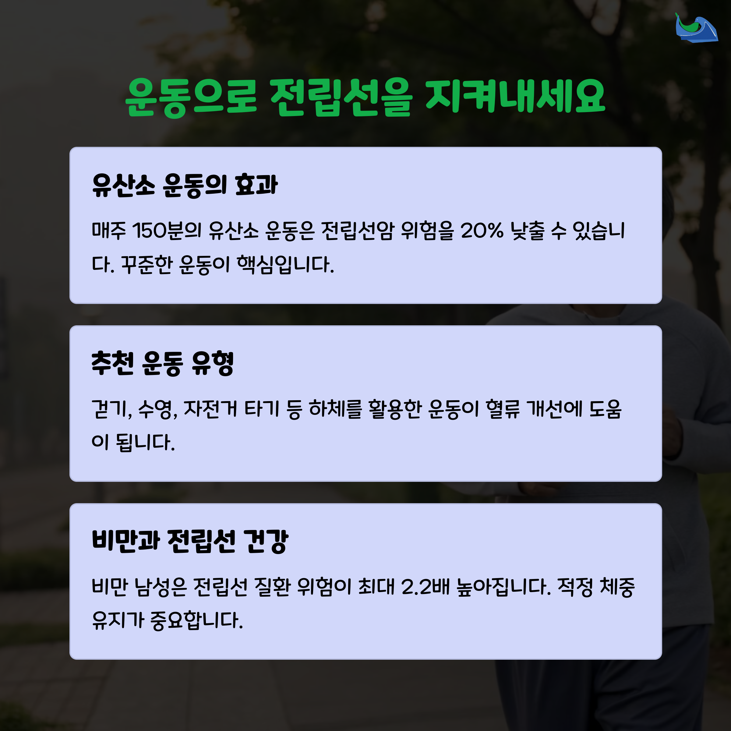 운동은 전립선 주변 혈액순환을 촉진해 염증과 비대를 예방하는 데 도움을 줍니다.